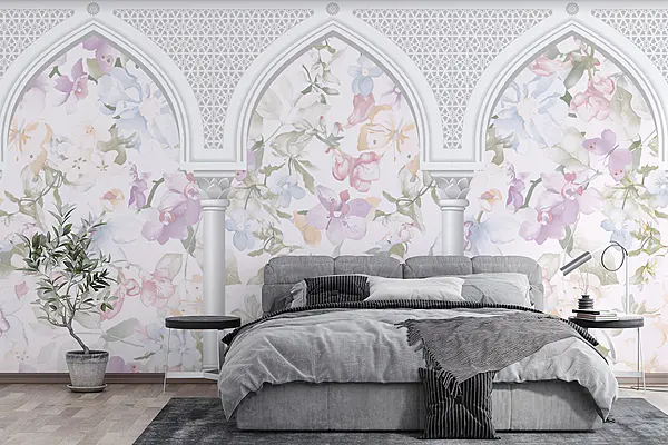 Wall murals Wallpaper with purple flowers and butterflies