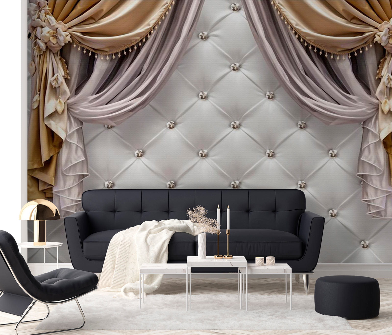 Transform your space with this fabulous wall mural featuring elegant drapes and decorative fabric. It evokes a cozy yet sophisticated atmosphere, perfect for setting a warm stage in your living room or bedroom. Imagine walking in and feeling like you’ve stepped into a stylish boutique or a charming café. The soft colors and gentle folds add a touch of grace, almost inviting you to reach out and touch the fabric.
