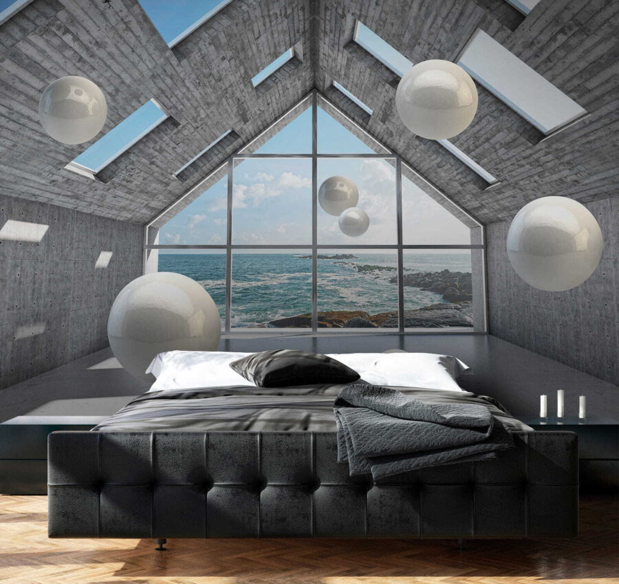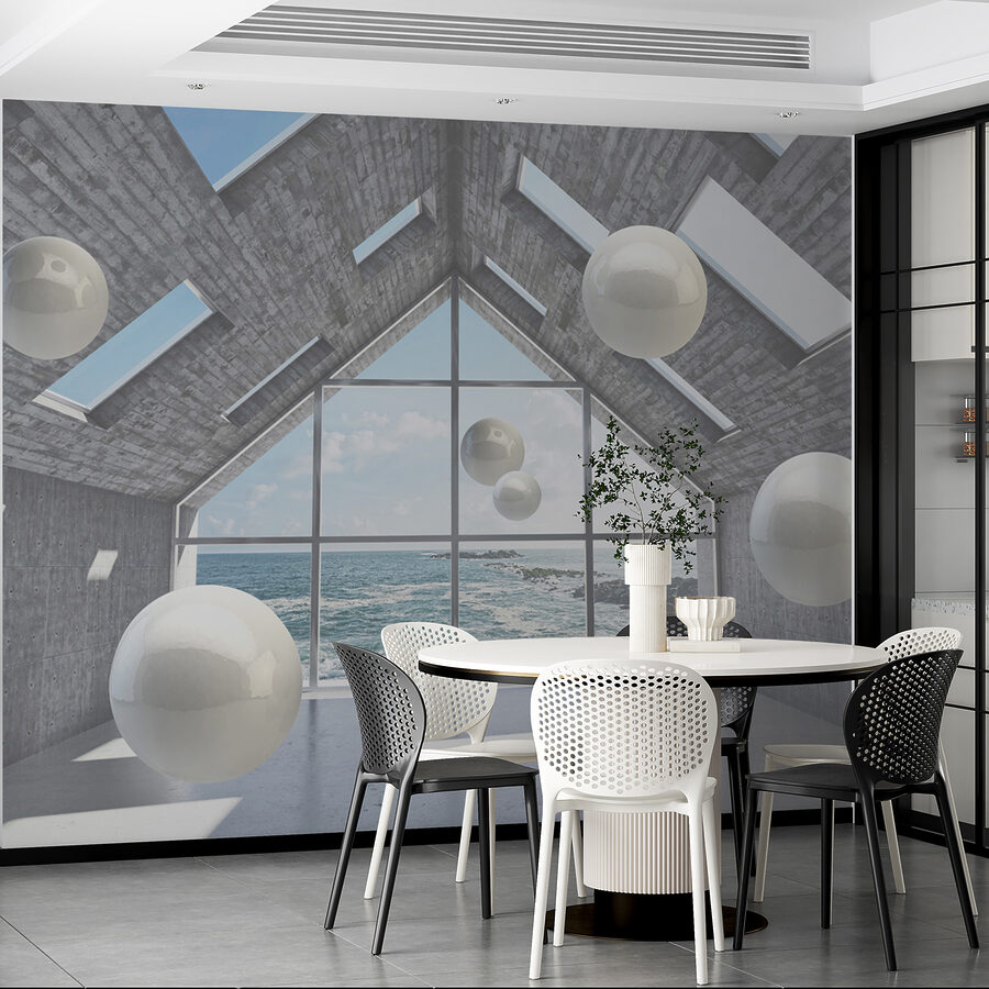 Transform any space with this eye-catching mural, “Wall murals White sphere in a concrete room.” It’s like peering into a dreamy, modern art installation right from the comfort of home. Those floating spheres against a sleek concrete backdrop and stunning ocean view? Total vibe. Imagine relaxing in your living room, and every glance at this mural ignites a spark of inspiration. Friends will definitely do a double take—some might even think it’s actual art. It brings an airy, spacious feel, perfect for a cozy nook or open-concept zone. Seriously, a wall like this can turn an ordinary room into a little slice of magic. Why settle for boring when you can have something that makes every day feel a bit more special?