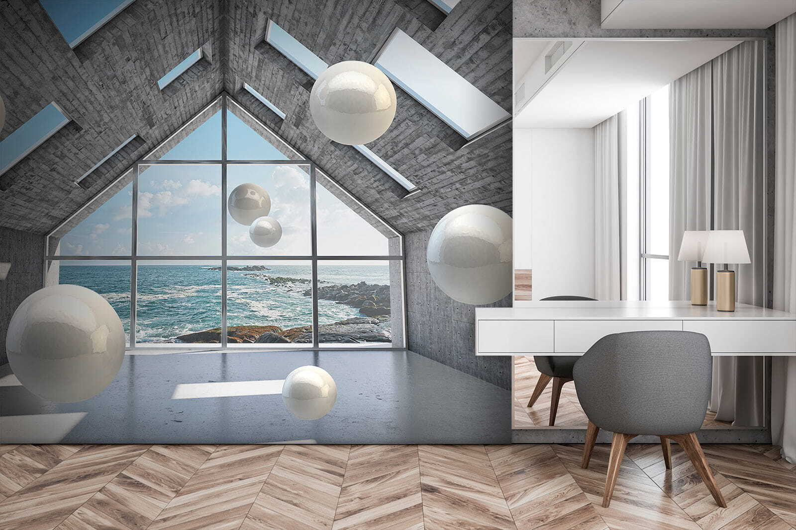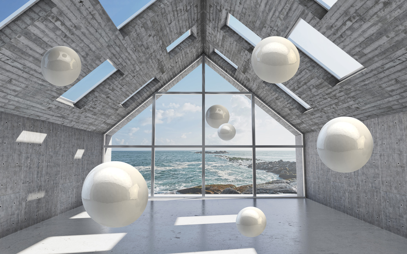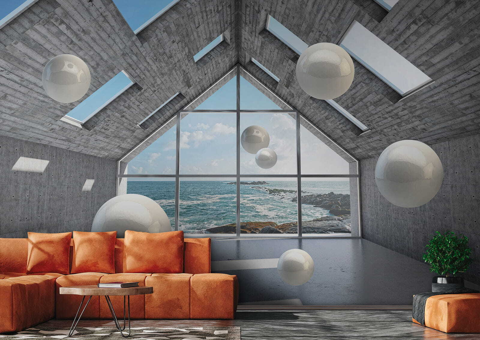 Transform any space with this eye-catching mural, “Wall murals White sphere in a concrete room.” It’s like peering into a dreamy, modern art installation right from the comfort of home. Those floating spheres against a sleek concrete backdrop and stunning ocean view? Total vibe. Imagine relaxing in your living room, and every glance at this mural ignites a spark of inspiration. Friends will definitely do a double take—some might even think it’s actual art. It brings an airy, spacious feel, perfect for a cozy nook or open-concept zone. Seriously, a wall like this can turn an ordinary room into a little slice of magic. Why settle for boring when you can have something that makes every day feel a bit more special?