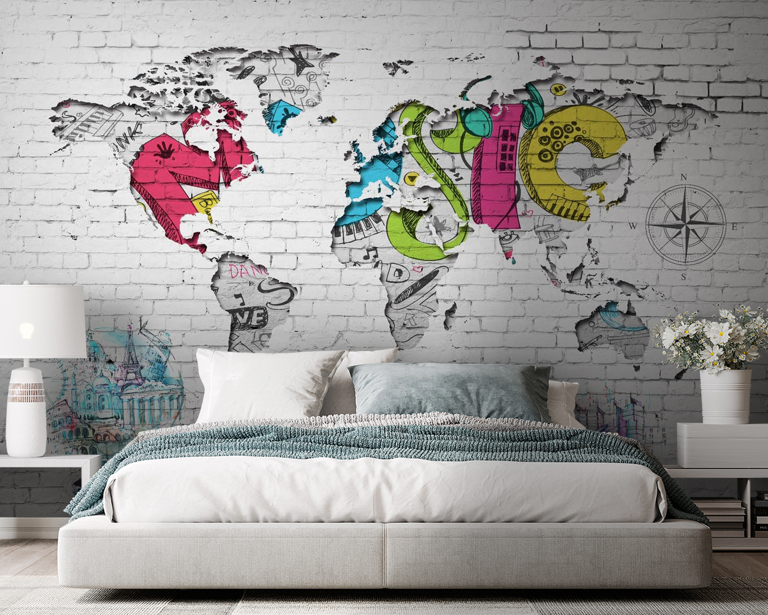 Transform any room with this vibrant mural that features a playful take on the world map. It’s like travel right on your wall—each colorful splash tells a story. Imagine standing in front of it, coffee in hand, and dreaming about your next adventure. Those whimsical doodles add a spark of fun, reminding everyone that there’s a big, beautiful world out there. Perfect for a young creative’s space, it brings a sense of joy and inspiration that can brighten any day. Who knew geography could look so good? Add some personality to your decor with this stunning piece!