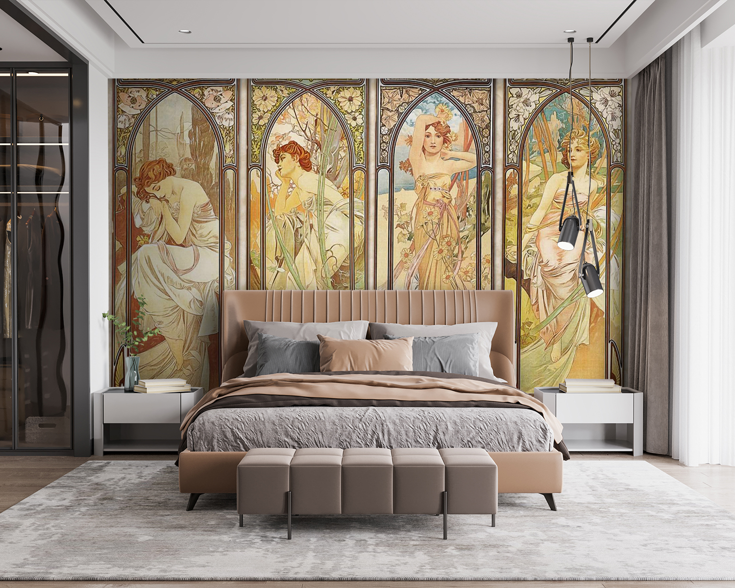 Transform your space with this enchanting wall mural featuring a charming group of women in an art nouveau style. Imagine waking up and feeling like you’ve stepped into a whimsical dream, where flowing lines and vibrant colors dance across your walls. Each woman tells a story, lost in thought or celebrating nature. It’s like they’re inviting you into their world, right from the moment you walk in. Perfect for a cozy reading nook or an artistic centerpiece, this mural pulls you in, making you feel like art is alive. Plus, who wouldn’t enjoy a daily dose of beauty? Maybe add a comfy chair, a good book, and just savor that magical vibe. Trust me, it’ll turn any room into a little sanctuary.