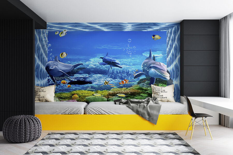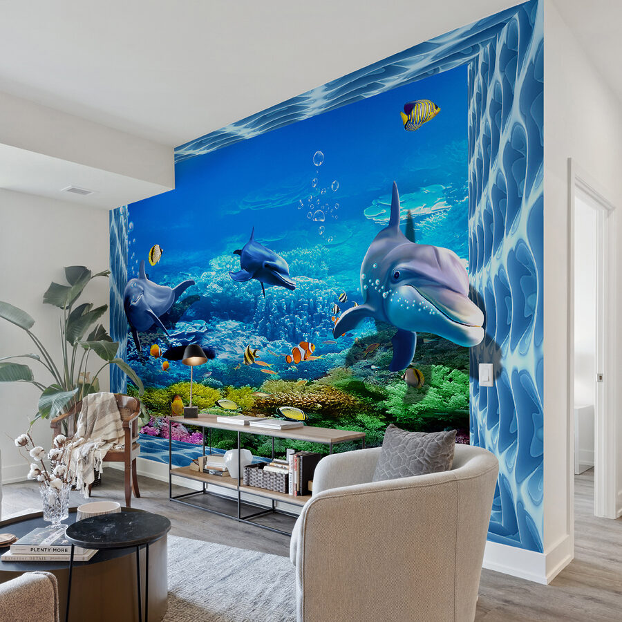 Dive into a splash of color with this cheerful mural featuring dolphins frolicking in a vibrant underwater world. Picture it: bright coral reefs, playful fish darting around, and those friendly dolphins inviting you to join their aquatic dance. It’s like having a piece of the ocean right on your wall! Perfect for a kid’s room or a playful living space, this mural sets a whimsical mood. Imagine waking up to the sight of these lively creatures, sparking joy and enhancing your sense of adventure. Transform any wall into a magical escape—who wouldn’t want to swim with dolphins?