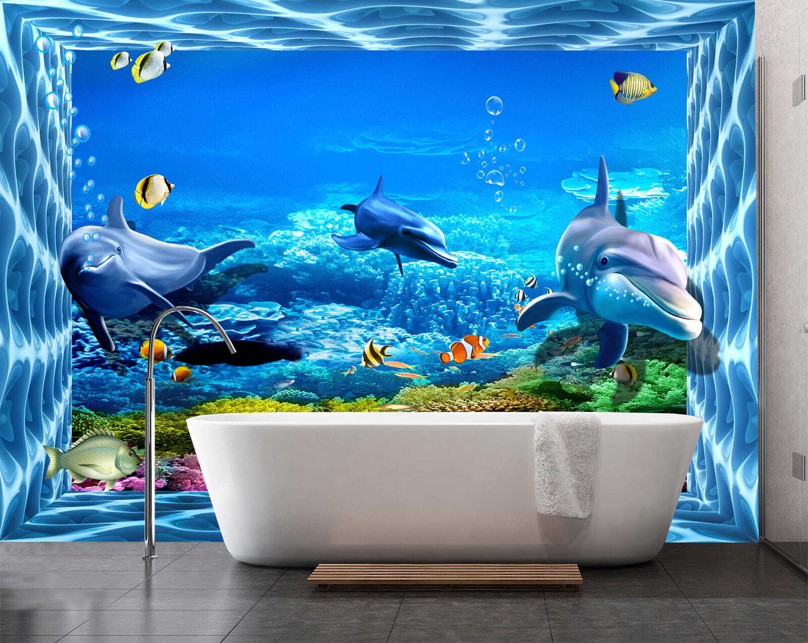 Dive into a splash of color with this cheerful mural featuring dolphins frolicking in a vibrant underwater world. Picture it: bright coral reefs, playful fish darting around, and those friendly dolphins inviting you to join their aquatic dance. It’s like having a piece of the ocean right on your wall! Perfect for a kid’s room or a playful living space, this mural sets a whimsical mood. Imagine waking up to the sight of these lively creatures, sparking joy and enhancing your sense of adventure. Transform any wall into a magical escape—who wouldn’t want to swim with dolphins?