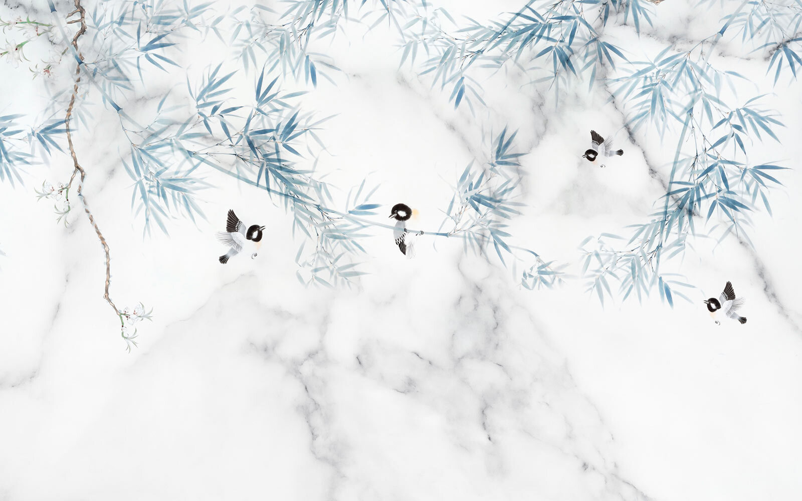 Imagine stepping into a serene oasis right in your living room. This stunning mural combines a white marble backdrop with delicate blue leaves and charming little birds. It feels like nature is whispering secrets just beyond your wall. The soft colors invite calm vibes, making it perfect for a cozy reading nook or even a bright kitchen. Picture sipping coffee while those whimsical birds seem to flit around. It’s like a delightful escape from everyday chaos—who wouldn’t want that? Transform your space into a gentle haven, and let the beauty of nature be your daily inspiration.