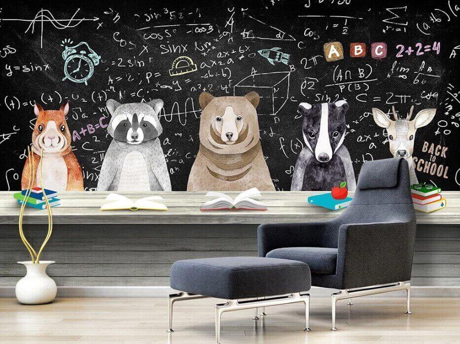 Step into a whimsical classroom where nature and learning collide! This charming mural, featuring adorable animal students—think raccoons, bears, and a wise old deer—sits against a chalkboard filled with playful equations and letters. It’s like a fun back-to-school vibe every day, perfect for a kid’s room or a creative workspace. Imagine the giggles as kids try to study beside their furry friends. The soft colors and lighthearted theme bring warmth, making you feel right at home. Plus, who wouldn’t want a bear keeping an eye on their homework? It’s both educational and super cute, adding a sprinkle of joy to any wall!