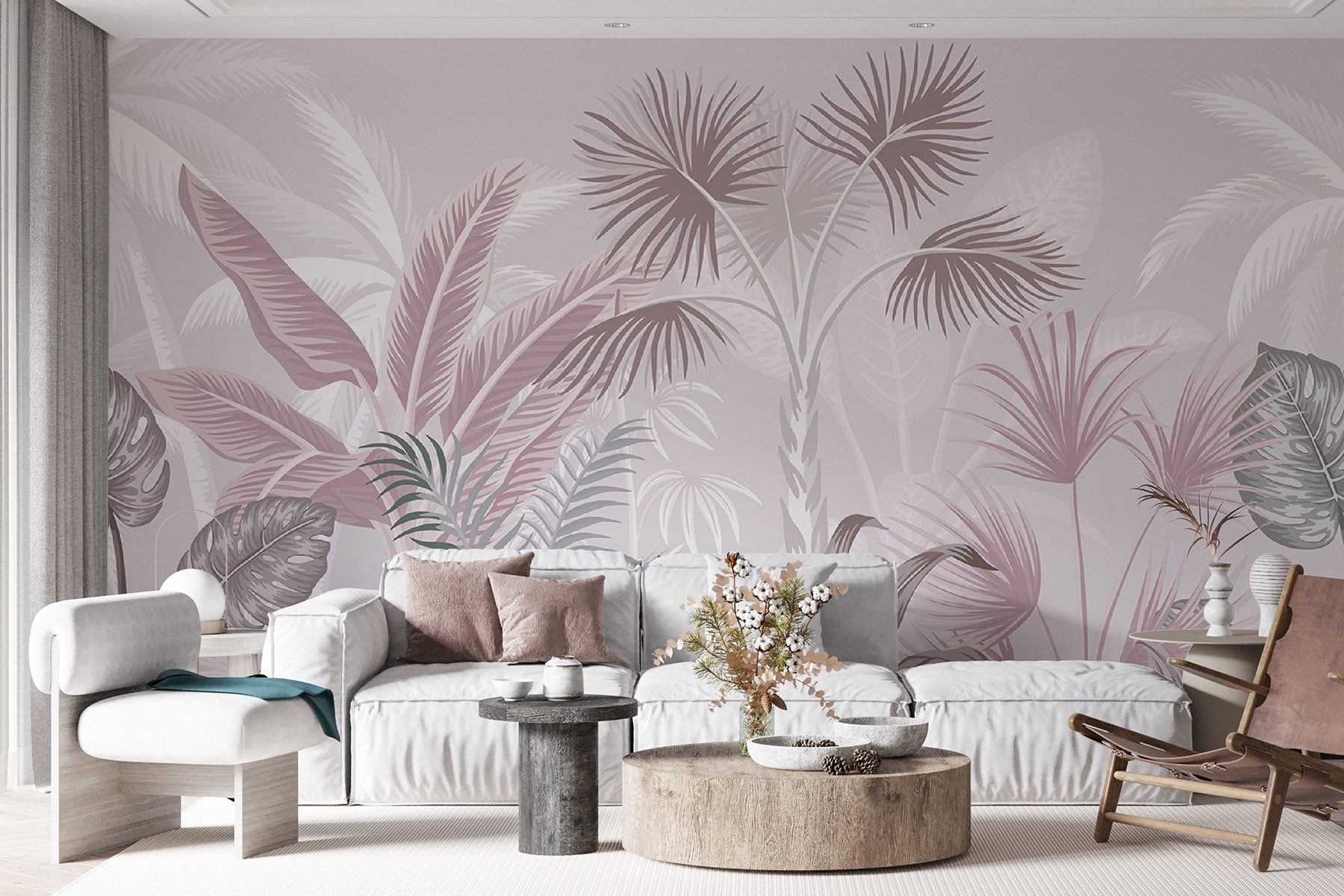 Transforming a dull wall into a botanical paradise is as easy as this enchanting mural with pastel leaves. Imagine stepping into a lush jungle without ever leaving your living room. The soft hues of pink and green invite the calm of nature indoors, making it the perfect backdrop for cozy chats or sipping tea. It’s like having a little secret garden that always feels fresh, no matter the season. Friends will wonder where the real plants are—then you can just smile and say it’s all in the mural. A touch of whimsy, a splash of tranquility; this design really brings spaces to life. Perfect for those who love to blend modern decor with a hint of nature’s charm!