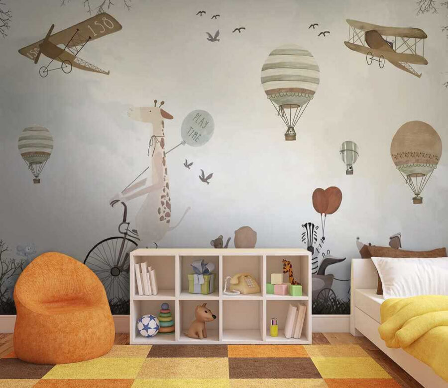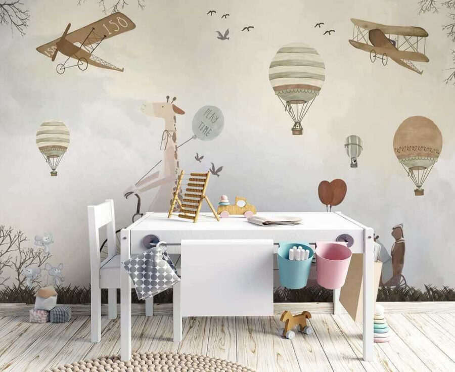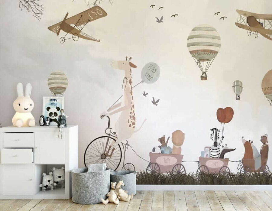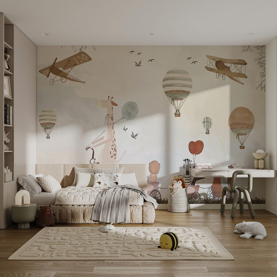 Imagine stepping into a world where whimsy meets adventure. This hot air balloon mural is like a ticket to your child’s imagination. Picture a giraffe gracefully pedaling a bike, a balloon in tow, while friends—adorable animals—chime in for a playful ride. The soft colors soothe, sparking joy without overwhelming the senses. Kids can gaze at those soaring balloons, dreaming of future flights. It’s like having a gentle storybook on the wall, inviting laughter and creativity. Transform playtime into a daily adventure—who wouldn’t want that? Add a touch of magic to any space!