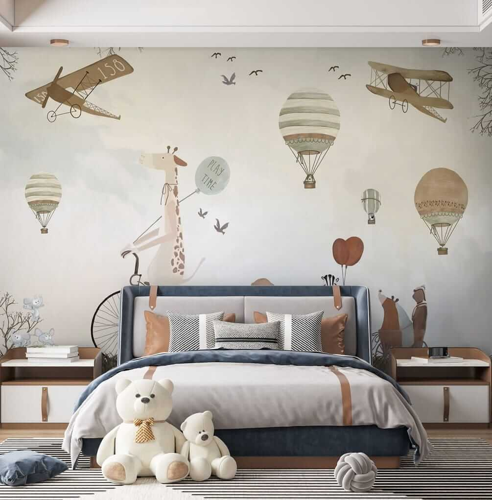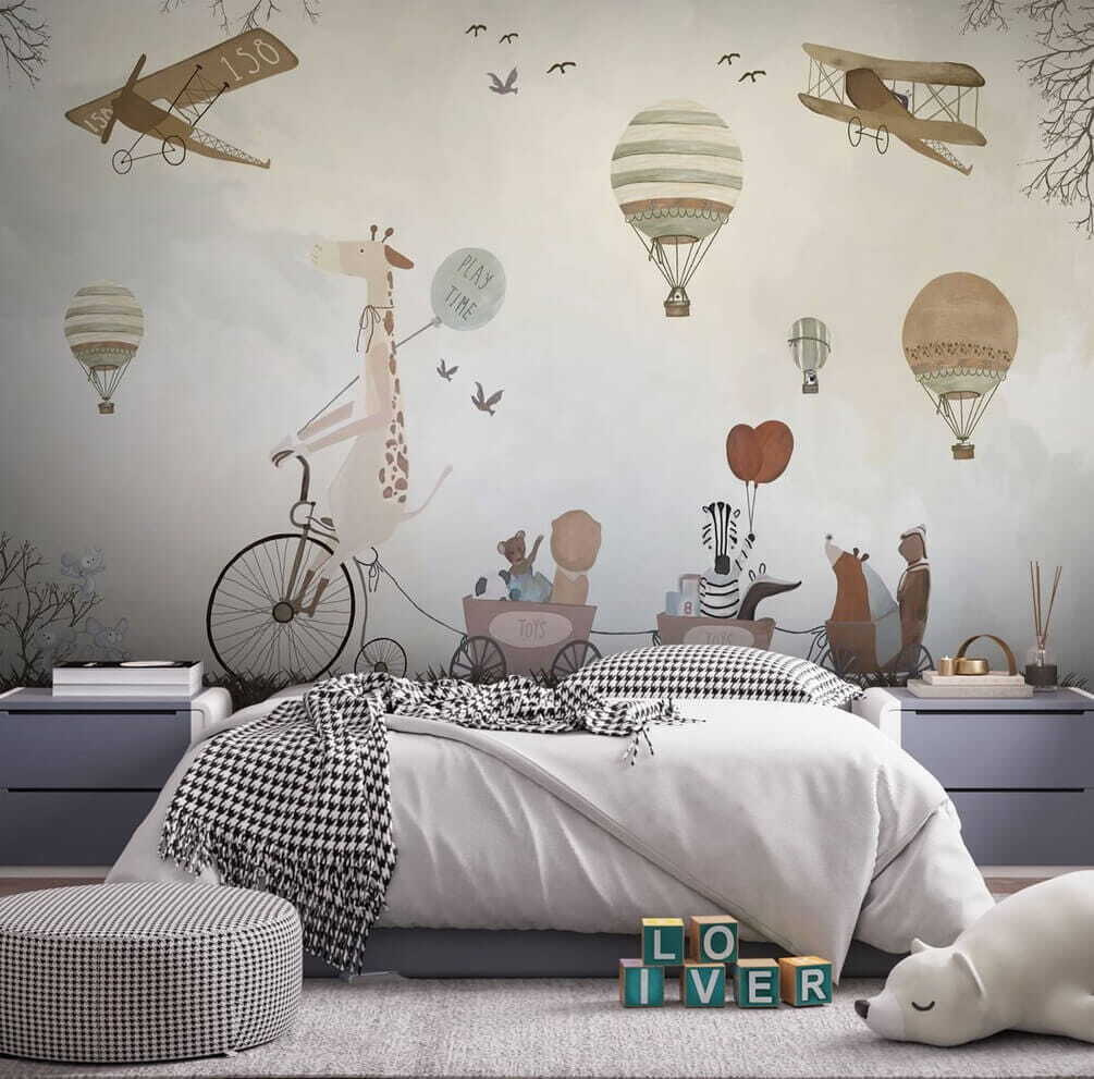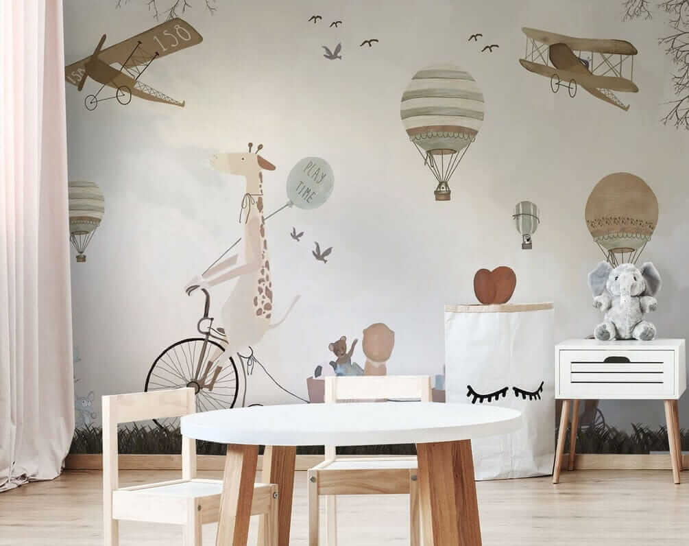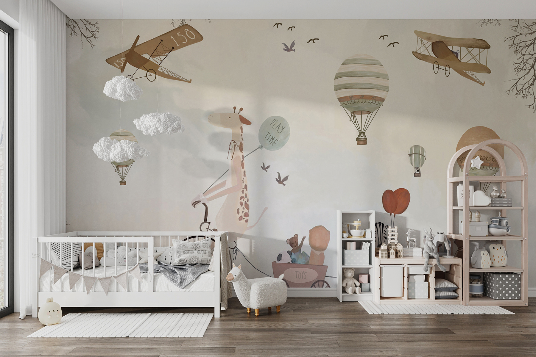 Imagine stepping into a world where whimsy meets adventure. This hot air balloon mural is like a ticket to your child’s imagination. Picture a giraffe gracefully pedaling a bike, a balloon in tow, while friends—adorable animals—chime in for a playful ride. The soft colors soothe, sparking joy without overwhelming the senses. Kids can gaze at those soaring balloons, dreaming of future flights. It’s like having a gentle storybook on the wall, inviting laughter and creativity. Transform playtime into a daily adventure—who wouldn’t want that? Add a touch of magic to any space!