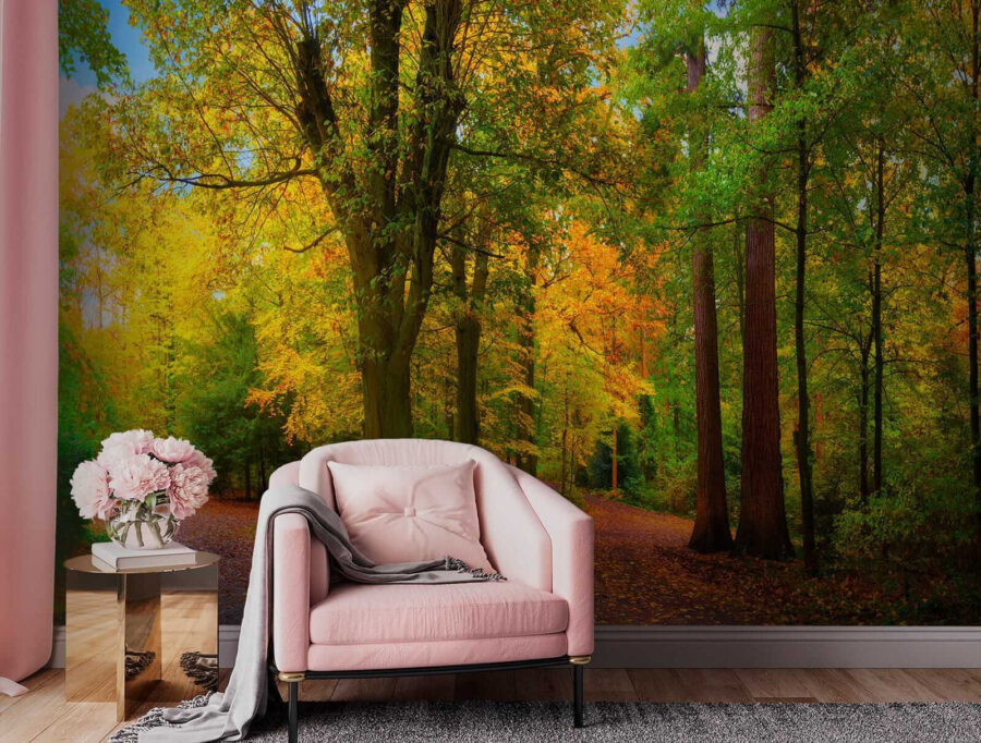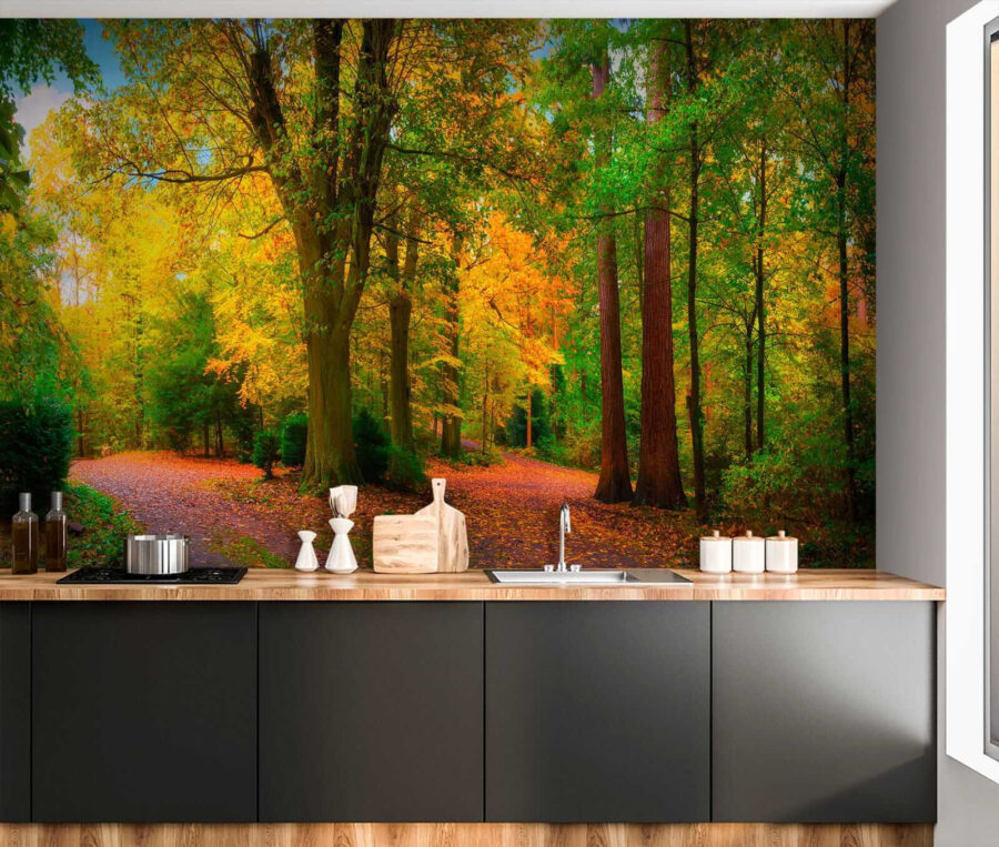Transform any space into a cozy woodland retreat with this stunning mural of a colorful autumn forest and winding path. Picture it: vibrant yellows, warm oranges, and lush greens swirling together, inviting you to take a leisurely stroll. It’s like bringing a piece of nature indoors, minus the bugs!