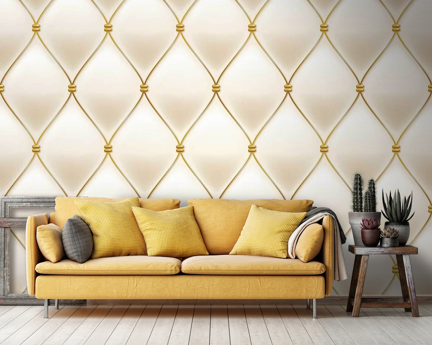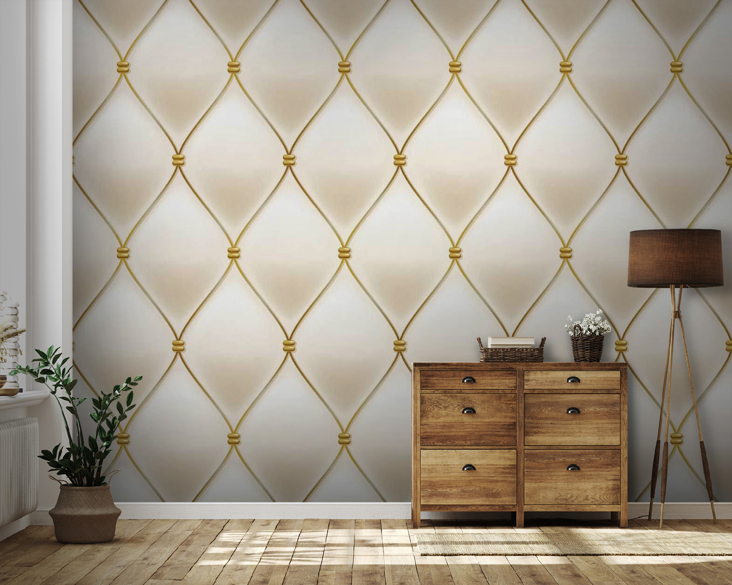 Transform any space with this eye-catching mural featuring an elegant fabric design and a playful diamond pattern that brings warmth and sophistication. Imagine walking into a room where the walls seem to whisper charm and comfort, wrapping you in a gentle embrace. It’s like stepping into a cozy secret garden—perfect for creating a serene reading nook or a stylish dining area. The subtle play of shapes keeps the eye dancing, inviting moments of reflection and conversation. Add a touch of delightful elegance to your home, because let’s face it, walls deserve a little love too!