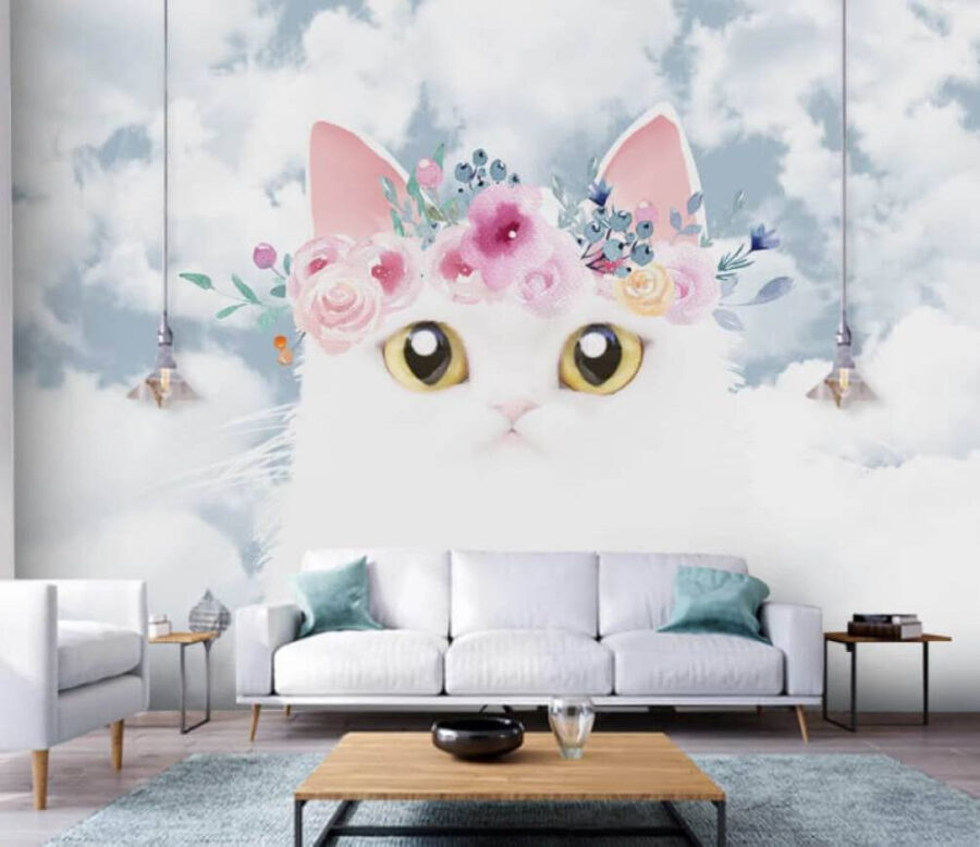 Transform any space into a whimsical retreat with this “White Cat with Floral Crown” wall mural. Imagine walking into a room where a charming cat gazes out at you, surrounded by soft clouds and a blooming floral crown. It’s like having your own little piece of paradise! Perfect for brightening up a nursery, cozy reading nook, or even that spot in the hallway that needs a little love. This mural invites smiles and sparks conversations, making every visitor feel a bit lighter. Plus, who wouldn’t want a cat that never needs feeding? It’s pure joy wrapped in art!