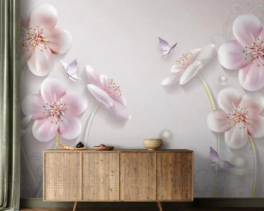 Transform your space into a dreamy escape with this enchanting wall mural featuring delicate flowers and fluttering butterflies. Imagine stepping into a serene Japanese garden every time you walk by. Soft pink blooms add a gentle touch, while subtle butterflies dance among them, bringing a sense of whimsy. This mural could easily spark daydreams, perhaps of spring picnics or lazy afternoons sipping tea. It’s the perfect backdrop for cozy gatherings or quiet moments alone. Trust us, a little floral magic can brighten any room—you might even find yourself smiling for no reason at all.