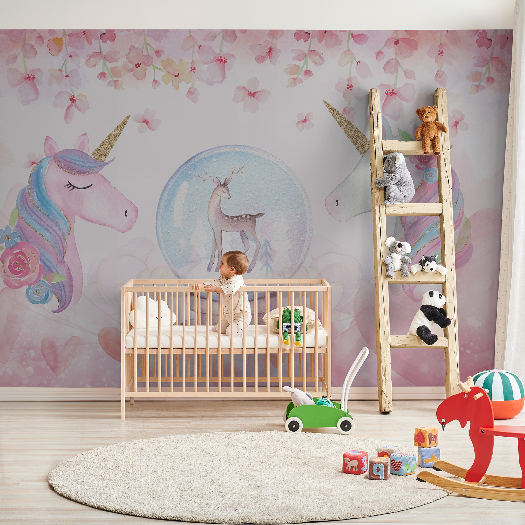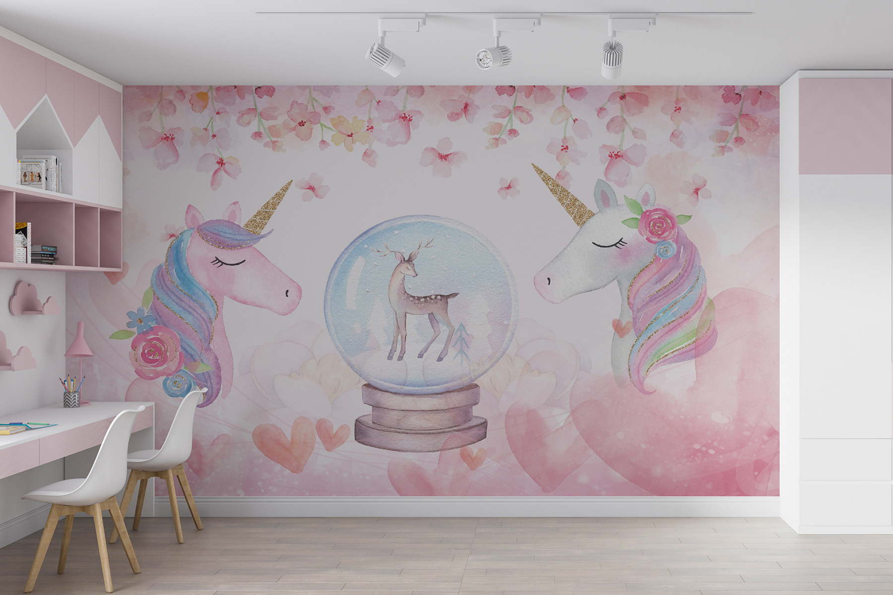Transform any space into a whimsical wonderland with this enchanting watercolor mural of unicorns! Imagine two charming unicorns, pastel manes flowing like cotton candy, gazing over a magical snow globe. It’s like a fairytale explosion—hearts, flowers, and dreamy hues everywhere. Perfect for a child’s room, play area, or wherever imagination runs wild. Every glance sparks joy and a little giggle, like rediscovering a childhood secret. Bring this mural home, and who knows? Maybe it’ll inspire a few fantastical adventures! Perfect for those who believe in magic.