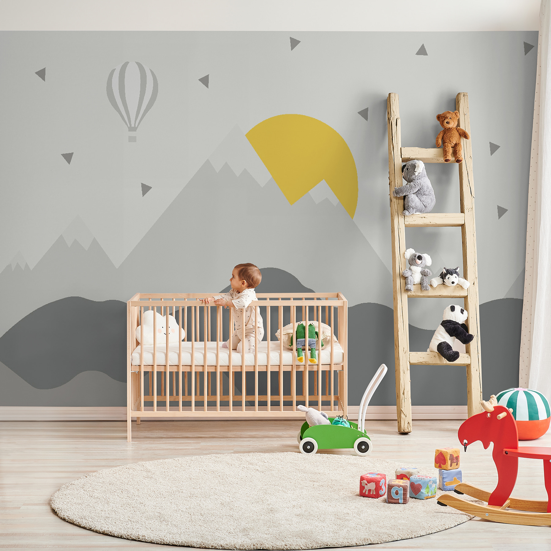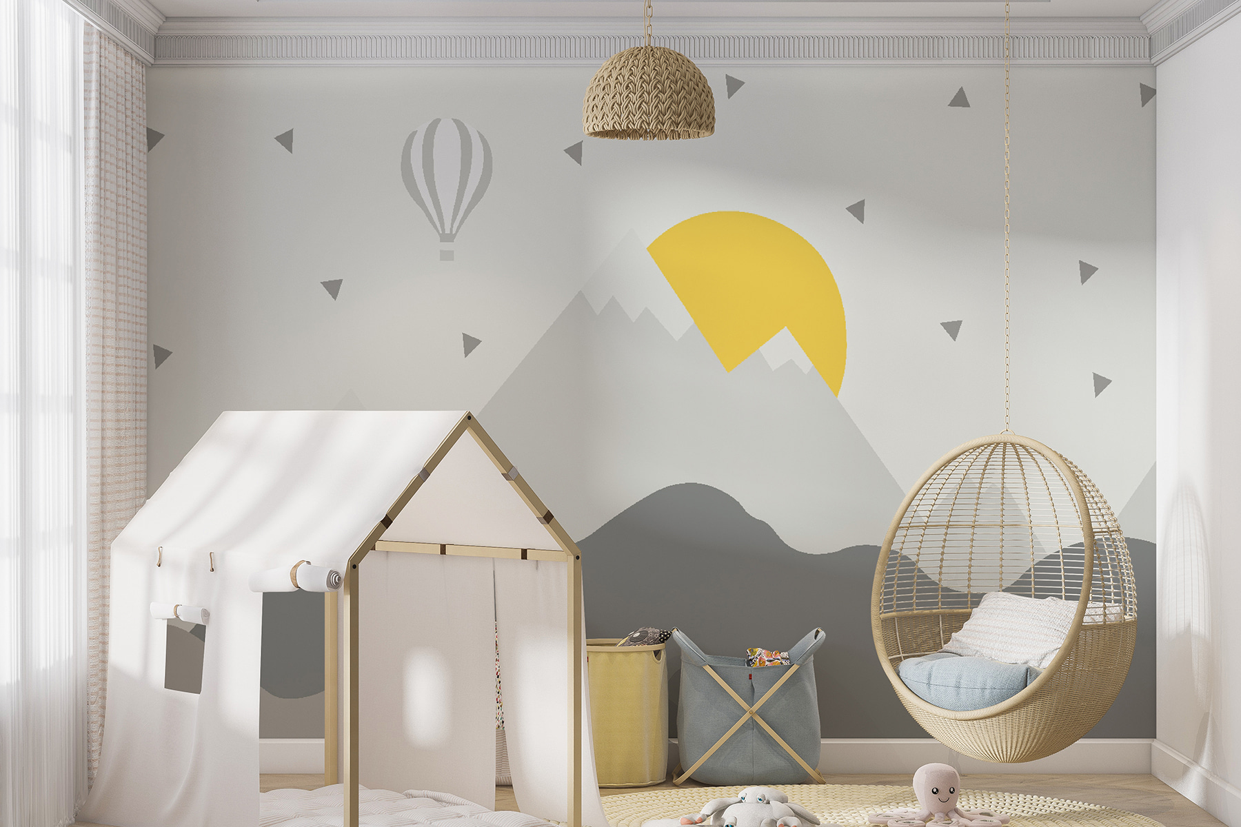 Transform a child’s room into a whimsical adventure with this “Hot Air Balloon Over Mountains” mural. Imagine little ones gazing at colorful balloons drifting above serene, gray mountains—they might even dream up their own adventures! The gentle sunrise adds a touch of magic, as if the mountains are whispering secrets from above. Perfect for sparking creativity, this mural can turn any wall into a canvas of imagination. Plus, it’s a great way to keep the room feeling light and fun—no worries about messy fingerprints here! Who wouldn’t feel inspired by a little hot air balloon escapade?