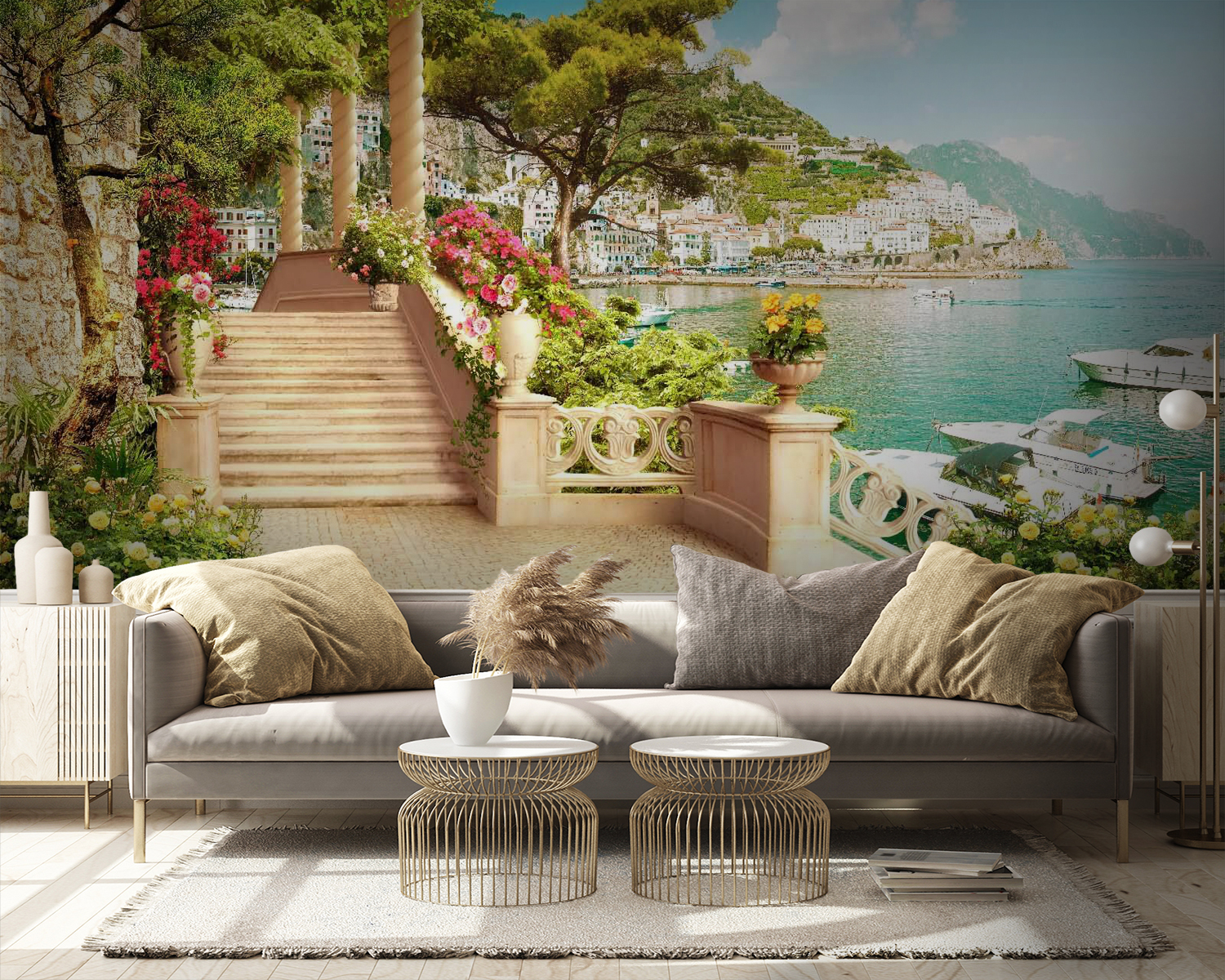 Imagine walking into a sun-drenched space that instantly transports you to a serene coastal escape. This wall mural, depicting a charming terrace with blooming flowers and a stunning view of the coastline, does just that. Picture yourself sipping a cup of coffee, the gentle scent of flowers mingling with the ocean breeze, while a soft chime of distant boat bells plays in the background. It’s like a mini-vacation every day! Perfect for living rooms or cozy nooks, this mural adds a dash of tranquility and a sprinkle of whimsy—turning any wall into a conversation starter. Who wouldn’t want that?