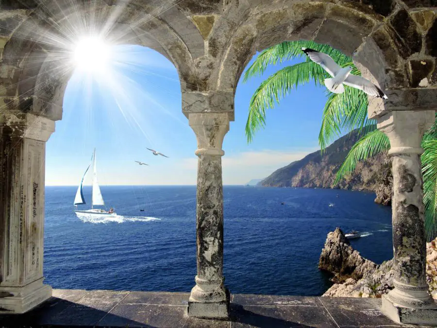 Step into a slice of paradise with the “View of the Ocean from a Stone Archway” wall mural. Imagine waking up to the soft sounds of waves and the smell of salty air, all from the comfort of your living room. This mural creates a little escape, making it feel like there’s always a sunny day right outside your door. Those soaring seagulls and the charming sailboat just vibe perfectly with the gentle sway of palm trees, whispering relaxation. It’s like a vacation without the packing! Perfect for anyone who loves a touch of seaside charm and wants to make their space feel a bit more magical. Just think of the conversations it’ll spark—who doesn’t love a good beach story? And hey, no sunscreen required!