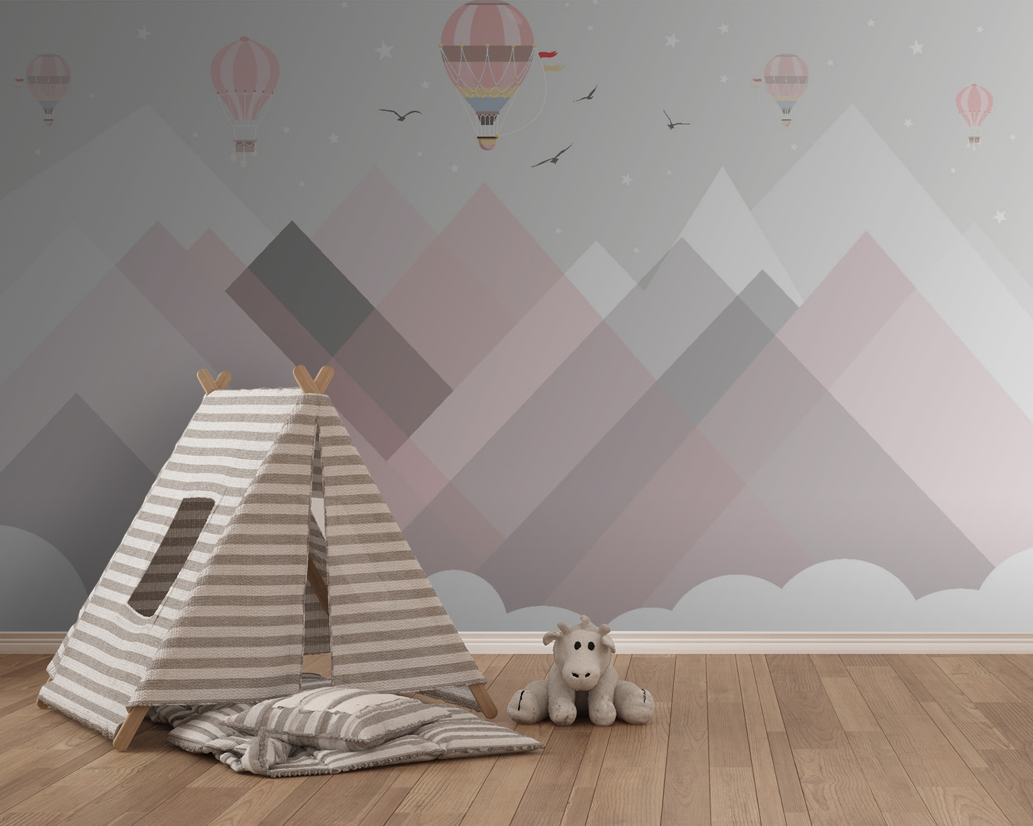 Elevate your space with this enchanting mural featuring hot air balloons soaring gracefully over whimsical mountains. Imagine walking into a room that feels instantly lighter and more cheerful. The soft pastel colors bring a gentle warmth, perfect for a cozy reading nook or a playful kids’ room. It’s like having a mini-vacation wall where the sky’s the limit—literally! Every glance can spark a daydream about far-off adventures. Birds flit through the air, adding a touch of life to the serene landscape. This mural isn’t just decor; it’s an invitation to daydream and escape, making it a delightful addition to any wall!
