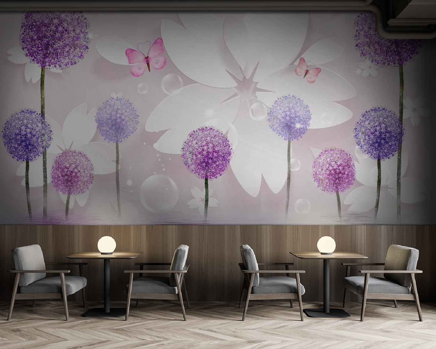 Wall murals Purple flowers and butterflies in harmony. (SKU: u17460)