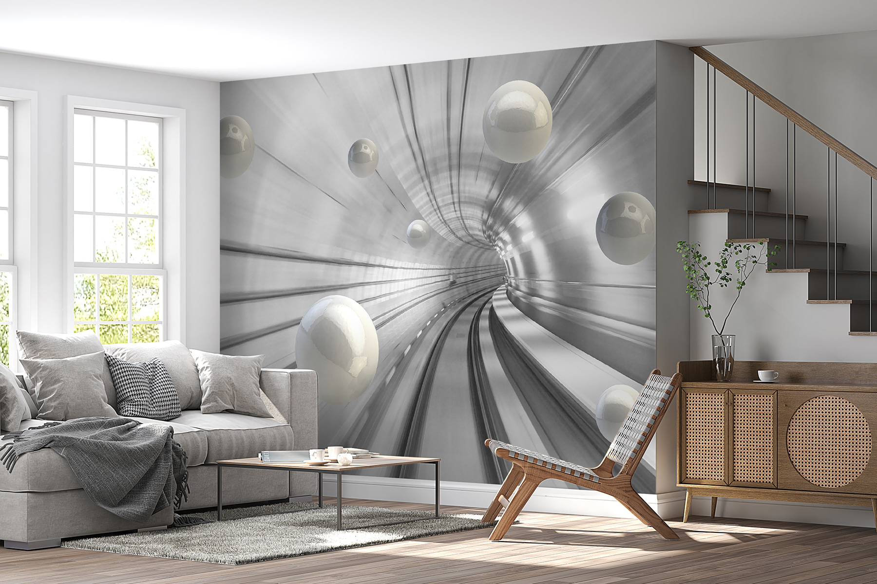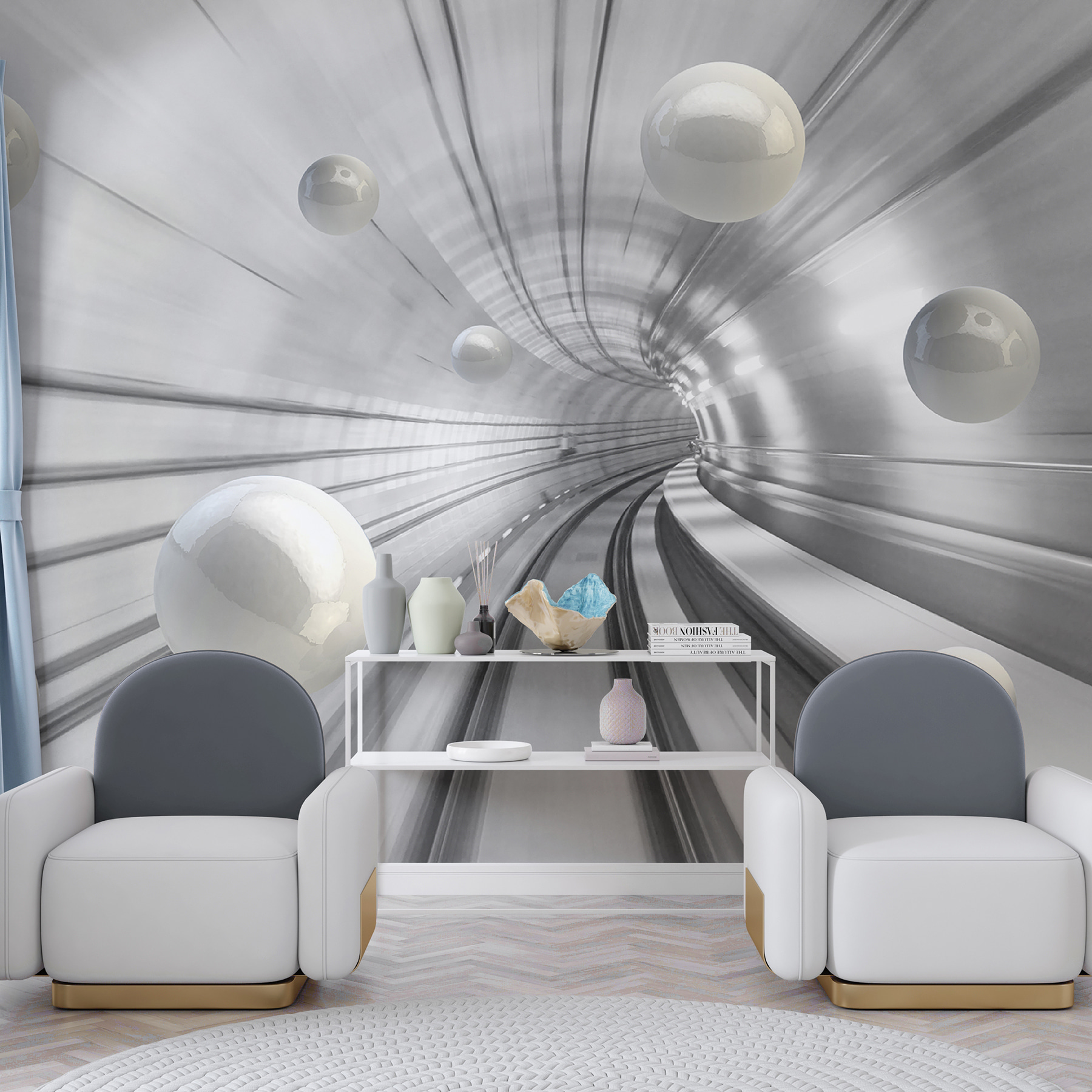 Transform your space with the “Wall Murals White Ball on a White Surface.” This striking design brings a touch of modern elegance and an almost cosmic vibe. Imagine stepping into a room that feels limitless—like you’ve been transported to a sleek, futuristic tunnel where white orbs float effortlessly. It’s calming yet intriguing, perfect for sparking conversations.