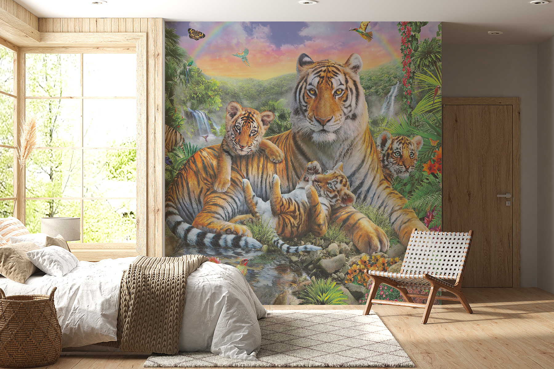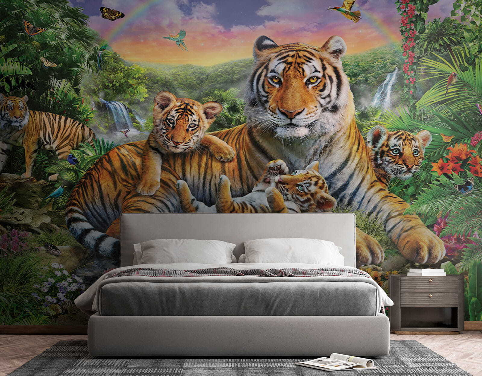 Transform any room into a vibrant oasis with this stunning “Tiger Standing in a Jungle” mural. Picture this: a family of playful tiger cubs frolicking around their majestic parent, surrounded by lush greenery and brilliant blooms. It’s like bringing a piece of the wild straight into your home! This mural doesn’t just add color; it sparks imagination and a sense of adventure, making it perfect for kids and the young at heart. Imagine waking up to this cheerful scene every morning—who wouldn’t feel inspired? Perfect for playrooms or nurseries, it’s a delightful reminder of nature’s beauty, and hey, it might even encourage the little ones to be a bit more majestic themselves!