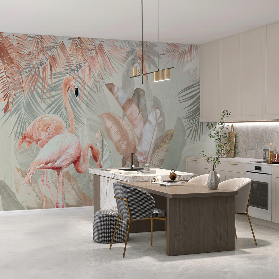 Brighten up your space with the “Flamingos Amidst Tropical Foliage” mural! Imagine stepping into a dreamy jungle every time you walk by. Those elegant flamingos, kicking back among lush green leaves, bring an effortless vibe of fun and tranquility. Whether it’s in a cozy living room or a chic home office, this mural adds a splash of whimsy without overwhelming the senses. Perfect for those days when reality feels a bit too beige. Plus, who wouldn’t want vibrant pink flamingos strutting about? It’s like a mini-vacation on your wall!