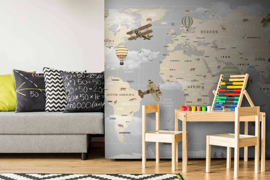 Transform any room into a whimsical journey with the “Map of the World with Airplanes and Hot Air Balloons” mural. Imagine stepping into a space that sparks wanderlust with subtle, dreamy tones, and playful designs dancing above continents. Each balloon and plane adds a dash of adventure—who wouldn’t want to daydream about globetrotting while sipping coffee?