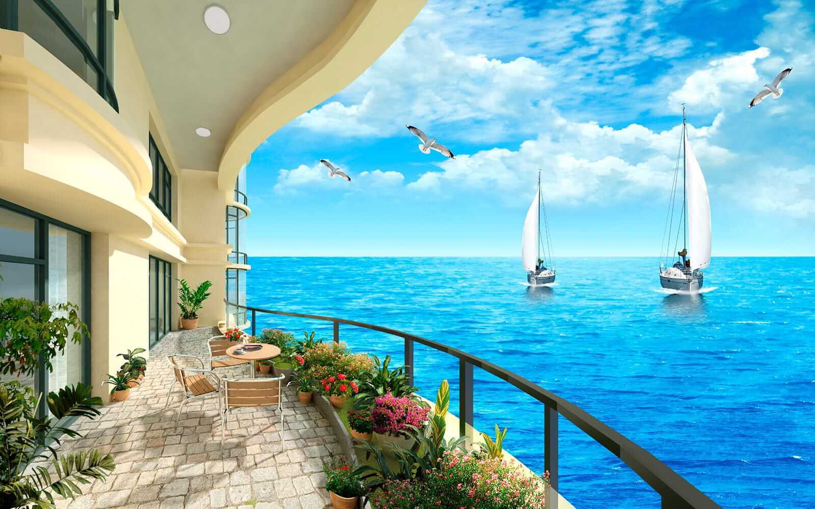 Transform any room into a seaside escape with this mural. Imagine stepping onto a vibrant balcony, where the gentle sound of waves meets the welcoming scent of salty air. Two sailboats glide effortlessly across a shimmering ocean, almost inviting you to hop aboard for an adventure. The lush, colorful plants along the balcony add a touch of warmth, making it feel like a hidden paradise. It’s like bringing a slice of holiday bliss into everyday life. Perfect for sparking daydreams or just enjoying morning coffee while feeling a sea breeze that isn’t actually there.