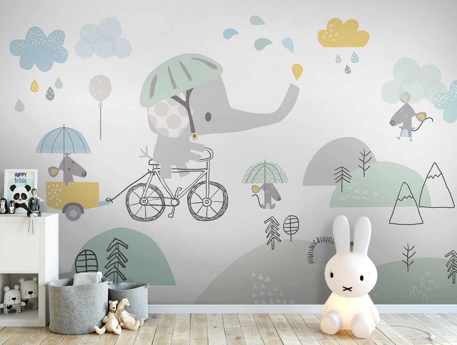 Brighten up any child’s room with this delightfully whimsical mural featuring a cartoon elephant on a bicycle—who wouldn’t want to see that? Imagine little ones gazing at this big guy, pedaling through a soft landscape with his animal pals. It’s like a storybook come to life! The playful colors and cute characters invite smiles, making it the perfect backdrop for adventures. Picture the giggles as kids share their own tales of escapades with this cheerful elephant. It’s more than decor; it’s a daily dose of joy! Perfect for sparking imagination.