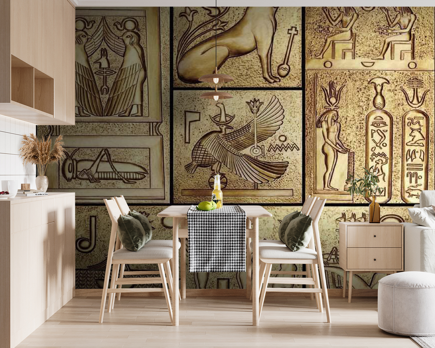 Transform your space with this stunning mural featuring a collage of ancient Egyptian symbols. Imagine stepping into a realm where history whispers secrets, and each symbol, from the majestic falcon to the mysterious hieroglyphs, tells a story. It’s like having a conversation with the past right on your wall! Perfect for a cozy reading nook or that one wall that needs a little magic, this mural instantly brings depth and character. Friends will marvel and might even ask if you’ve uncovered a hidden treasure. And who wouldn’t want that?
