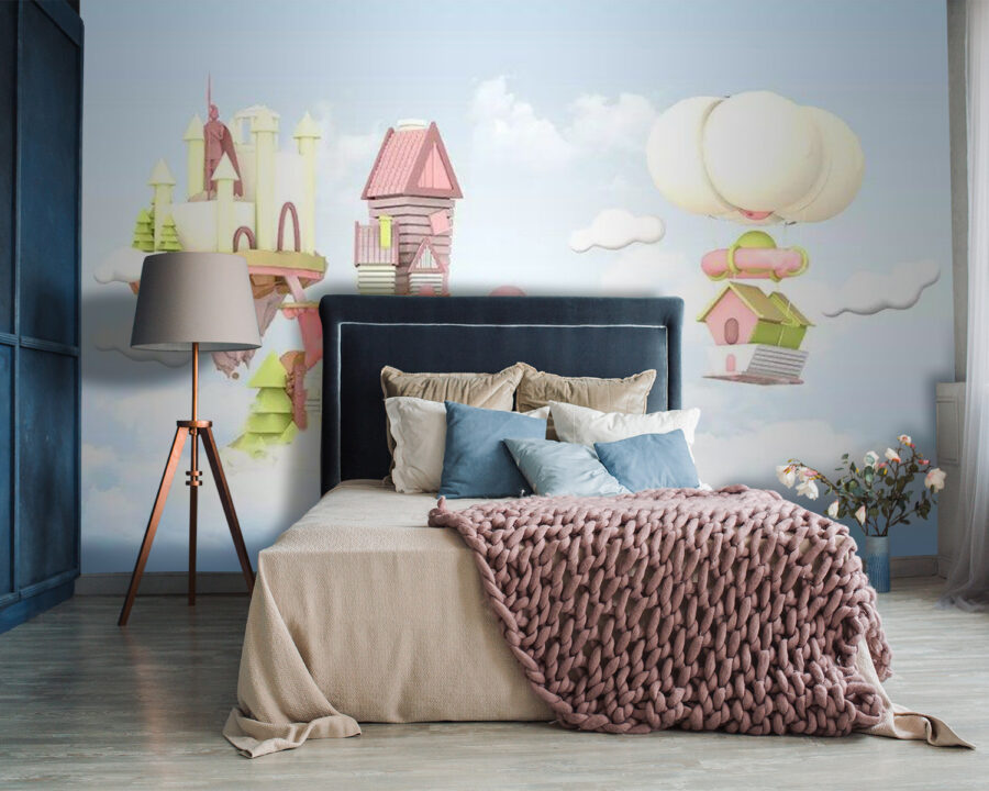 Transform any room into a whimsical escape with this wall mural featuring cartoon houses floating in the sky. Imagine stepping into a storybook world where delightful cottages drift among fluffy clouds. It’s like living in a daydream! This mural brings a splash of color and playfulness to a bedroom, playroom, or even a cozy reading nook.