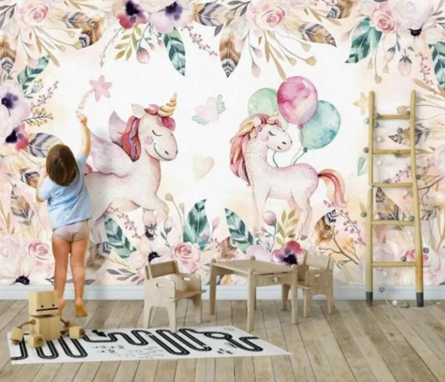 Transform a child’s room into a whimsical wonderland with this charming “Watercolor Unicorn with Balloons” mural. Picture it: pastel shades dancing across the wall, unicorns prancing about, and balloons in hand—what’s not to love? Each glance brings a little sprinkle of joy, perfect for igniting imagination. This mural doesn’t just decorate; it tells a playful story. Kids can dream of cozy adventures in a world where magic is real. Hang it up and watch as the space fills with laughter and inspiration. Because every room deserves a touch of enchantment!