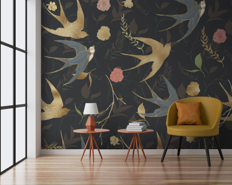 Transform your space into a cozy sanctuary with this enchanting wall mural featuring a dance of birds and blooms. Imagine walking into a room where graceful swallows soar against a backdrop of deep hues—it’s like a secret garden coming to life! The playful colors and charming details invite warmth, sparking joy every time you sneak a glance. Whether it’s in a living room or a creative corner, this mural whispers tales of nature’s beauty, making it hard not to smile. Perfect for adding character, it’s sure to start conversations—who knew a wall could be so captivating?