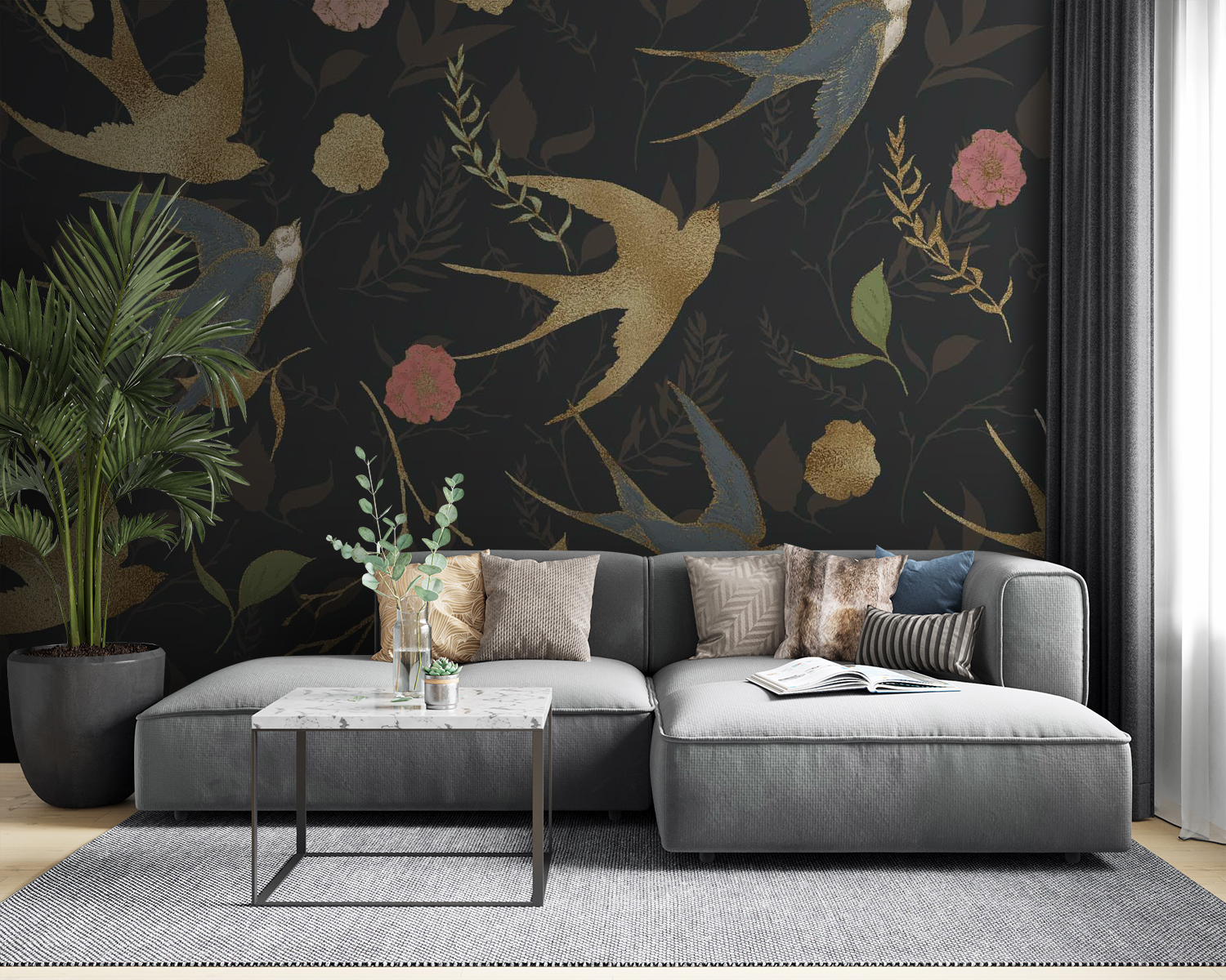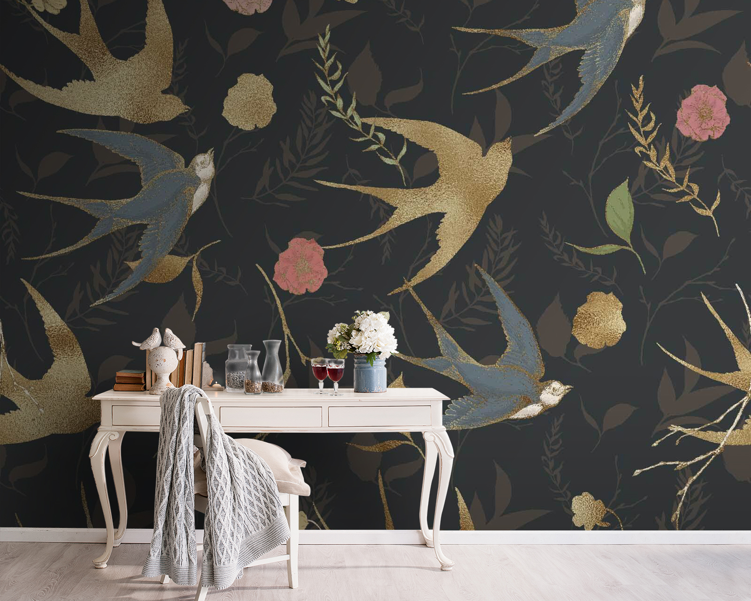 Transform your space into a cozy sanctuary with this enchanting wall mural featuring a dance of birds and blooms. Imagine walking into a room where graceful swallows soar against a backdrop of deep hues—it’s like a secret garden coming to life! The playful colors and charming details invite warmth, sparking joy every time you sneak a glance. Whether it’s in a living room or a creative corner, this mural whispers tales of nature’s beauty, making it hard not to smile. Perfect for adding character, it’s sure to start conversations—who knew a wall could be so captivating?