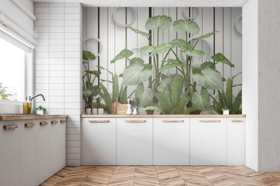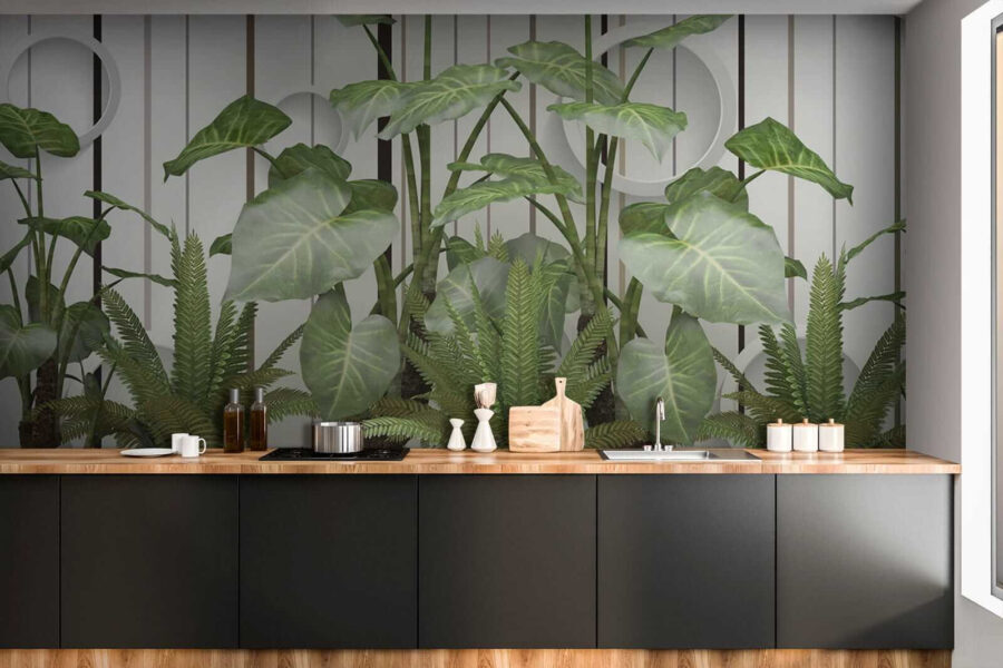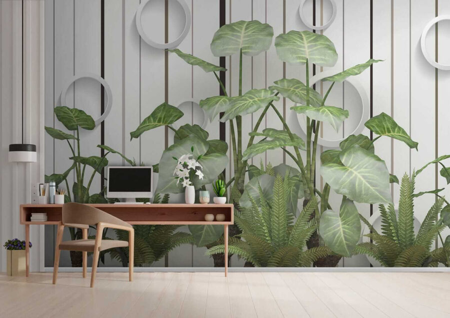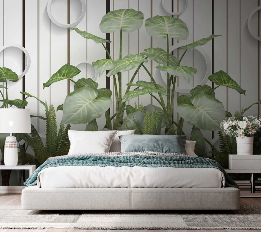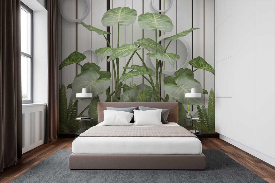 Transform any room into a tropical escape with this stunning mural, “Lush Leaves against a Striped Wall.” Imagine stepping into a breath of fresh air every time you enter the space—those vibrant greens just pop, and they’re set against sleek stripes that bring a modern twist. It’s like having a mini rainforest at home, but without the humidity. Perfect for a living room or even a cozy reading nook, this mural invites nature indoors while still feeling polished. Friends might just think you have a secret botanical garden. Who doesn’t love a conversation starter? Feel the room come alive, sparking smiles and a few “where’d you get that?” questions as everyone enjoys the refreshing vibe!