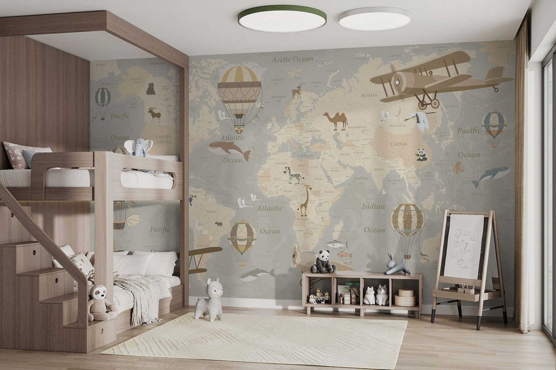 Transform any room with this whimsical wall mural featuring a charming map of the world, adorned with playful airplanes and hot air balloons. Imagine getting lost in this artful landscape—it’s like the entire globe is bringing adventure to your walls! Each detail invites curiosity, sparking dreams of far-off places. Picture a cozy reading nook or a child’s bedroom where conversations about travel and exploration come alive. And let’s face it—a giant, friendly giraffe peeking from Africa is just the icing on the cake. This isn’t just decor; it’s an open invitation to wander the world’s wonders without ever leaving home. Perfect for the adventurous spirit!