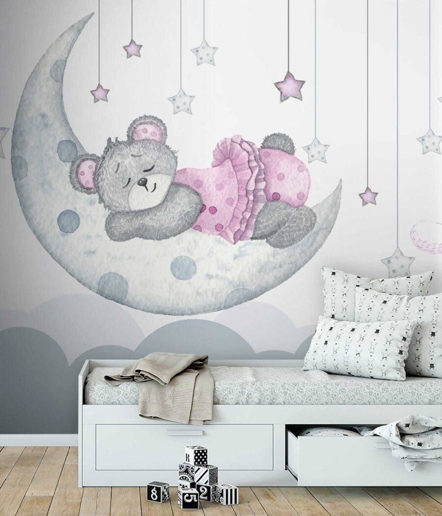Transform a child’s room into a whimsical wonderland with this delightful watercolor mural featuring an adorable teddy bear in a stylish pink dress. Imagine a sleepy bear gracefully dozing on a crescent moon, with soft, pastel stars twinkling all around—it’s like a cozy bedtime story come to life! The gentle colors and sweet design create a soothing atmosphere, perfect for inspiring sweet dreams. Kids will giggle at the charming bird perched nearby, and parents might find themselves smiling, too, reminiscing about their own cherished toys. No doubt, this mural invites warmth and joy, making any space feel like a magical escape.