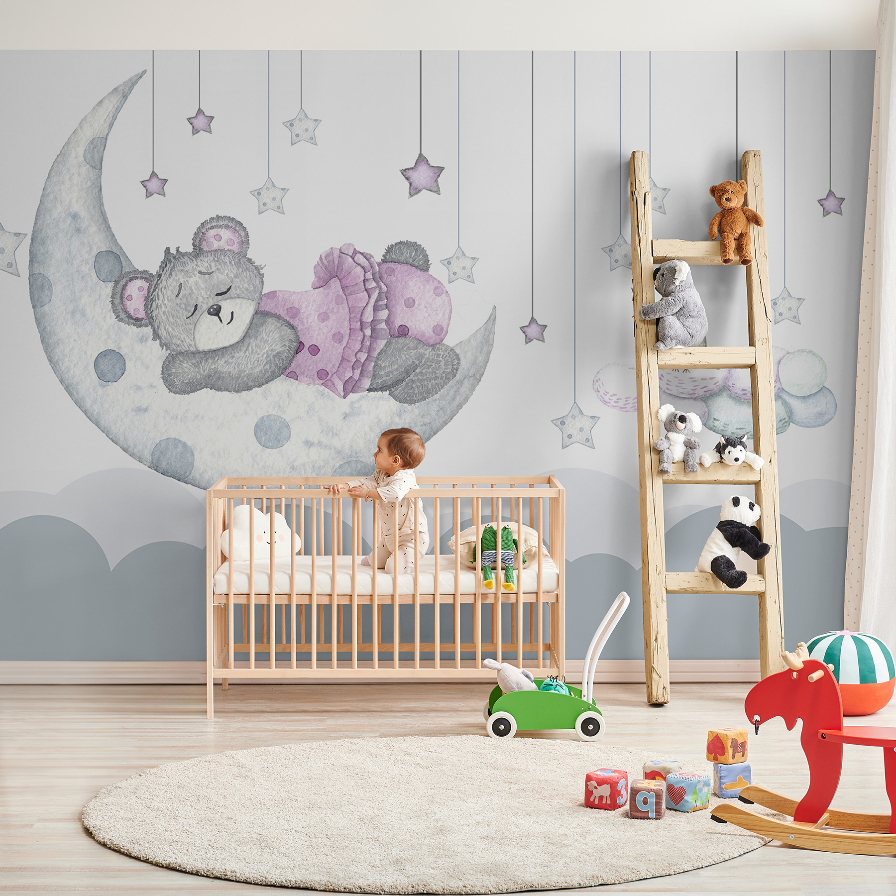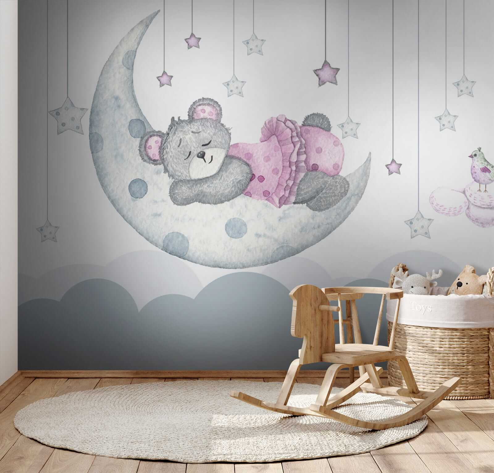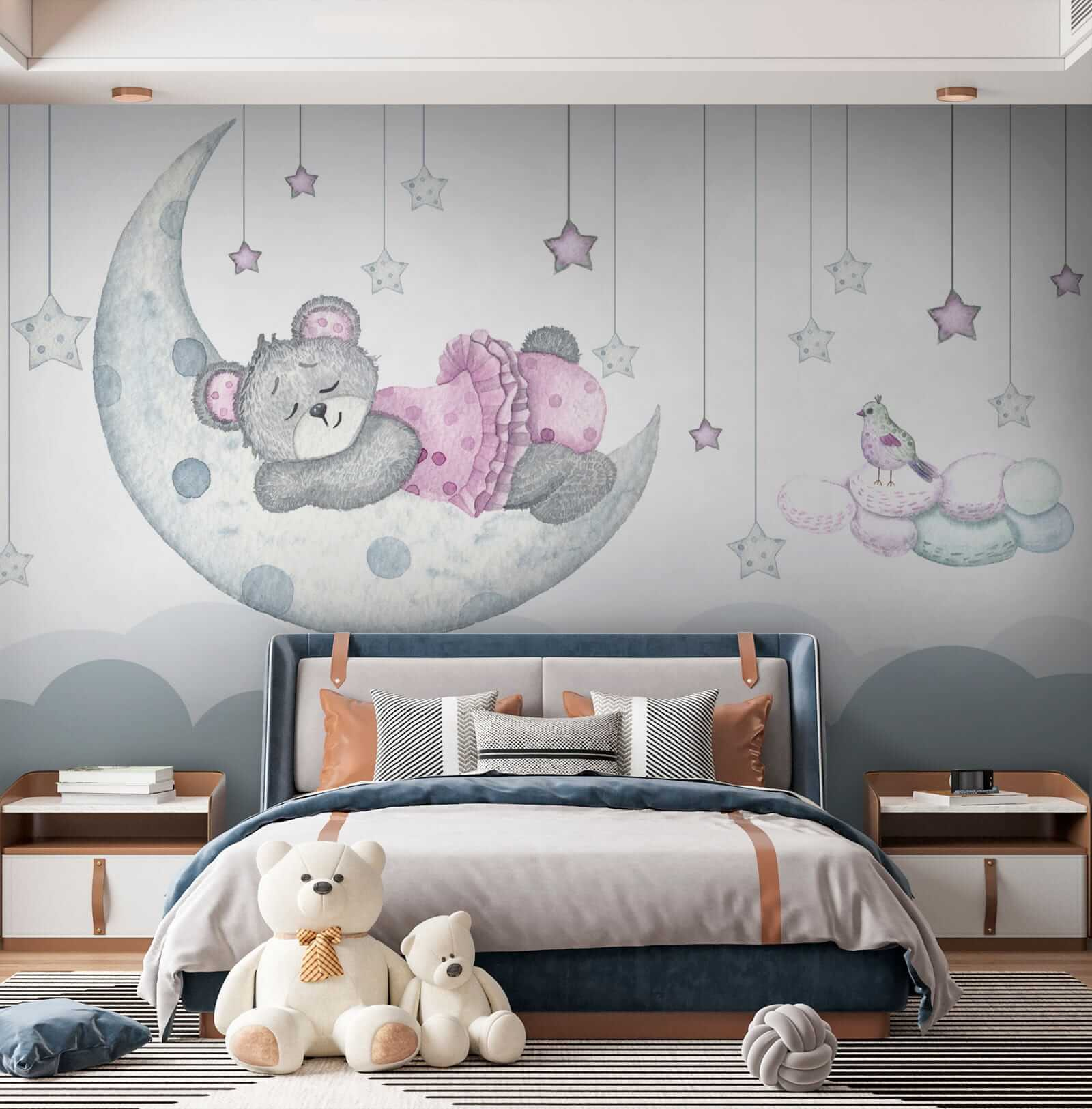 Transform a child’s room into a whimsical wonderland with this delightful watercolor mural featuring an adorable teddy bear in a stylish pink dress. Imagine a sleepy bear gracefully dozing on a crescent moon, with soft, pastel stars twinkling all around—it’s like a cozy bedtime story come to life! The gentle colors and sweet design create a soothing atmosphere, perfect for inspiring sweet dreams. Kids will giggle at the charming bird perched nearby, and parents might find themselves smiling, too, reminiscing about their own cherished toys. No doubt, this mural invites warmth and joy, making any space feel like a magical escape.