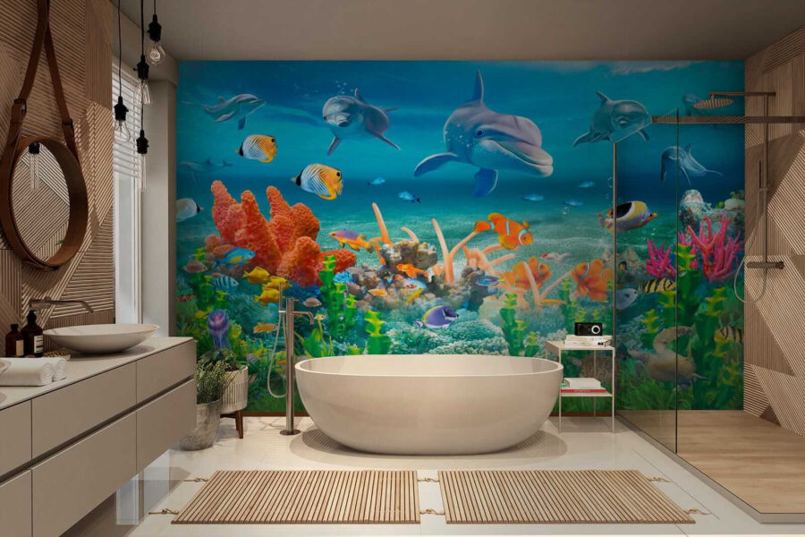 Dive into a world of wonder with this vibrant mural featuring dolphins swimming playfully in crystal-clear waters. It’s like a mini ocean right on your wall, perfect for sparking joy in any child’s room. Picture this: kids giggling as they spot friendly dolphins and bright clownfish among colorful corals. It’s not just decor; it’s a little slice of adventure that transforms a space into a sea of imagination! The soothing colors and lively scene create a calming atmosphere—ideal for sleepy time stories or daydreaming about underwater escapades. Perfect for sparking curiosity about marine life!