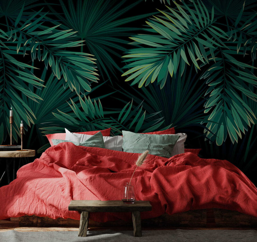 Transform any room into a tropical paradise with this vibrant mural showcasing lush leaves against a stunning black backdrop. It’s like bringing a piece of nature indoors, without having to worry about watering anything. Imagine walking into a space that feels alive, where each leaf whispers tales of far-off jungles. Whether it’s in the living room or a cozy reading nook, this mural sets the mood for relaxation. Guests will feel like they’ve stepped into a chic, tropical retreat. It’s a perfect conversation starter—after all, who doesn’t want to chat about their wild decor choices?