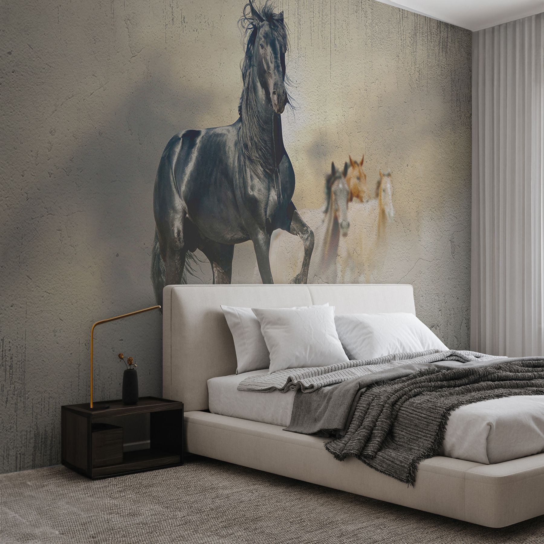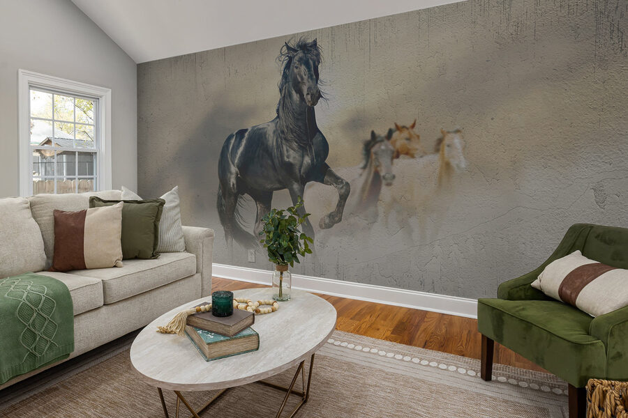 Transform a dull wall into a stunning landscape with this captivating mural featuring a majestic black horse with a flowing mane. Imagine entering a room where this striking equine creature seems to charge right at you, bringing a sense of wild freedom and grace. It’s not just a decoration; it’s a conversation starter. Perfect for animal lovers or anyone wanting to add a dash of drama to their space. Picture cozy evenings with friends, the mural silently adding charm and character, making every moment feel a bit more special. It’s like having a piece of the wild right at home, inviting a sense of tranquility amidst the lively hustle of life.