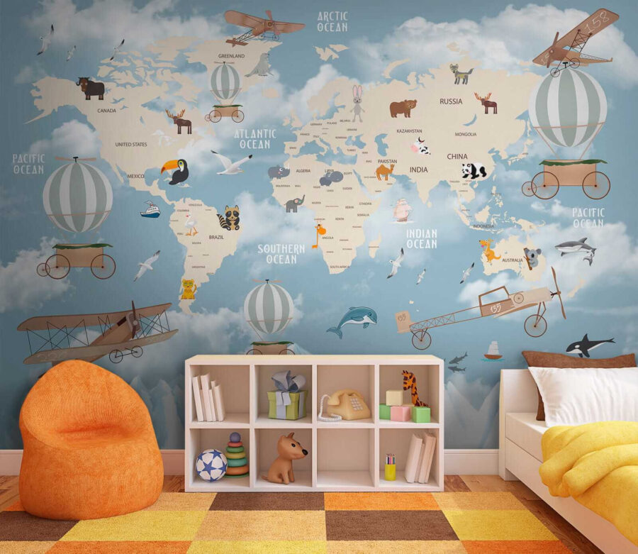 Transform any space with this delightful wall mural featuring a world map flanked by charming animals! Imagine a playful elephant brushing past a hot air balloon—seriously, how cute is that? Every continent comes to life, encouraging little explorers to dream about far-off places while sneaking in some geography lessons. It’s perfect for a nursery or a kid’s room, and trust us, it’ll spark some fun conversations. Picture bedtime stories set against a backdrop of adventurous critters! This mural isn’t just decor; it’s a mini adventure waiting to happen.