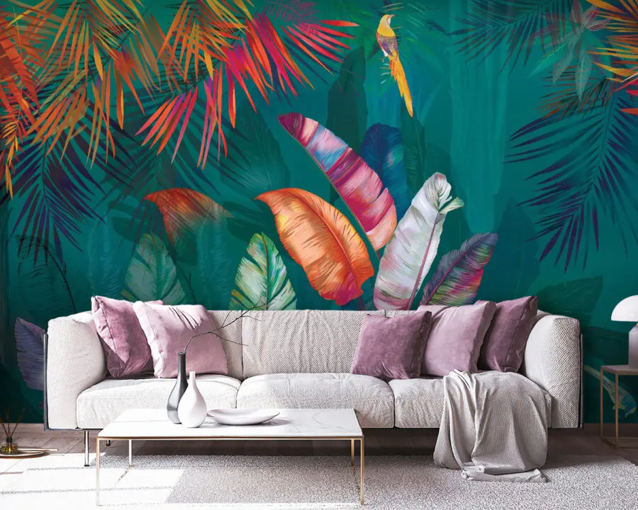 Transform your space into a tropical paradise with this vibrant wall mural featuring colorful jungle foliage. Imagine walking into a room where bright leaves and playful patterns instantly lift your mood—like a mini-vacation right at home! The rich greens and lively hues feel like a warm embrace from nature, making it perfect for a relaxation zone or a lively gathering spot. Picture sipping your morning coffee surrounded by a lush, vibrant landscape while a parrot cheers you on. It’s not just decor; it’s a daily adventure!