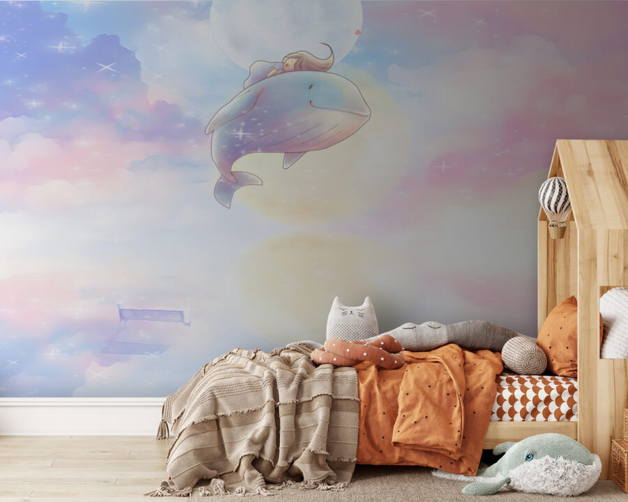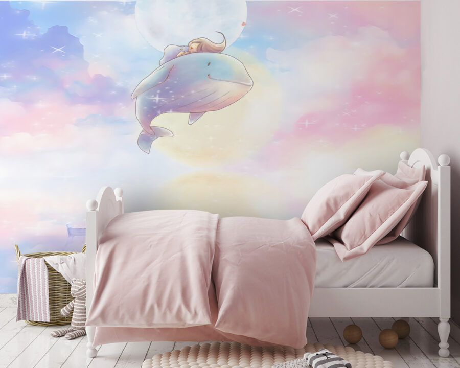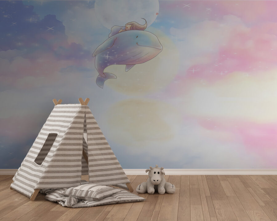 Dive into the dreamy world of this “Cartoon of a Whale” mural, where a whimsical whale floats among pastel clouds and a serene moon. It’s like a gentle hug for your child’s room, sparking giggles and daydreams. Imagine bedtime stories becoming even more magical in this enchanting space. Perfect for little ones who adore adventure and ocean life—this mural’s soft colors invite warmth and imagination. And let’s face it, who wouldn’t want a whale buddy keeping watch at night? Transform the walls into a canvas of wonder and let creativity swim freely!