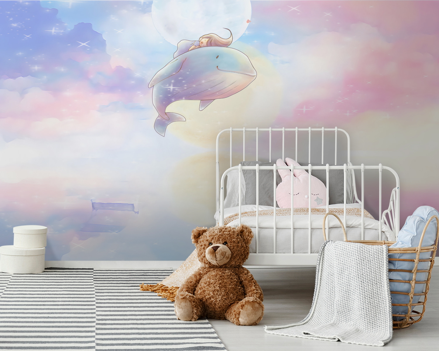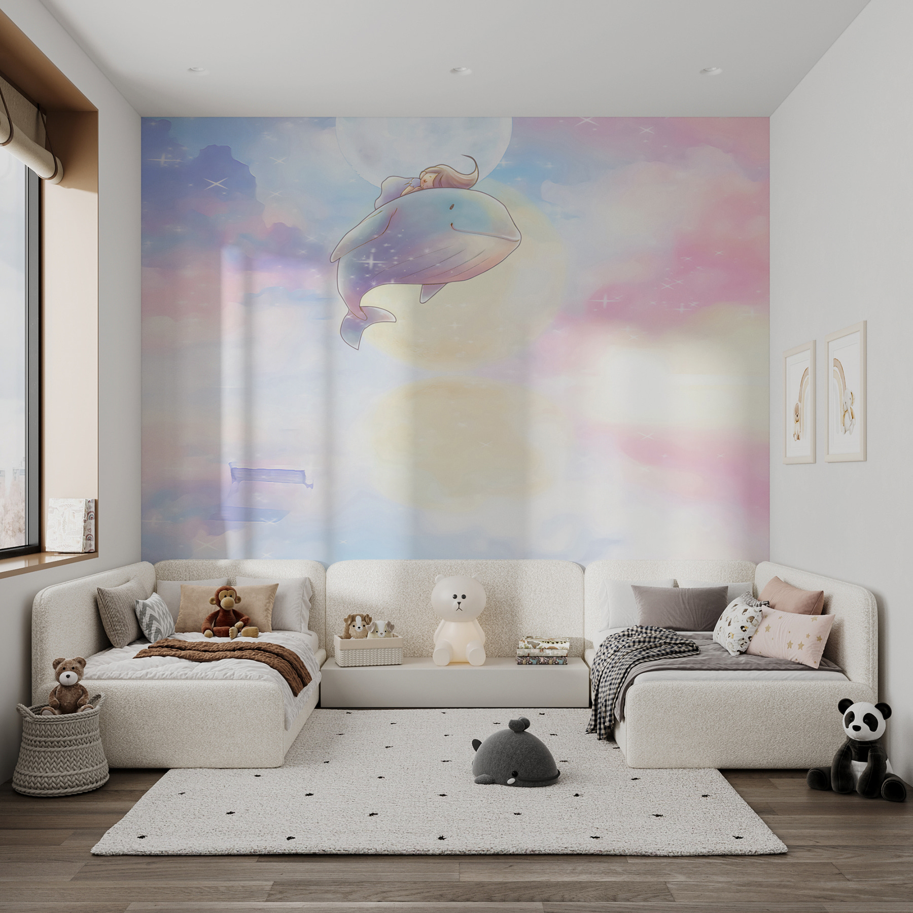 Dive into the dreamy world of this “Cartoon of a Whale” mural, where a whimsical whale floats among pastel clouds and a serene moon. It’s like a gentle hug for your child’s room, sparking giggles and daydreams. Imagine bedtime stories becoming even more magical in this enchanting space. Perfect for little ones who adore adventure and ocean life—this mural’s soft colors invite warmth and imagination. And let’s face it, who wouldn’t want a whale buddy keeping watch at night? Transform the walls into a canvas of wonder and let creativity swim freely!