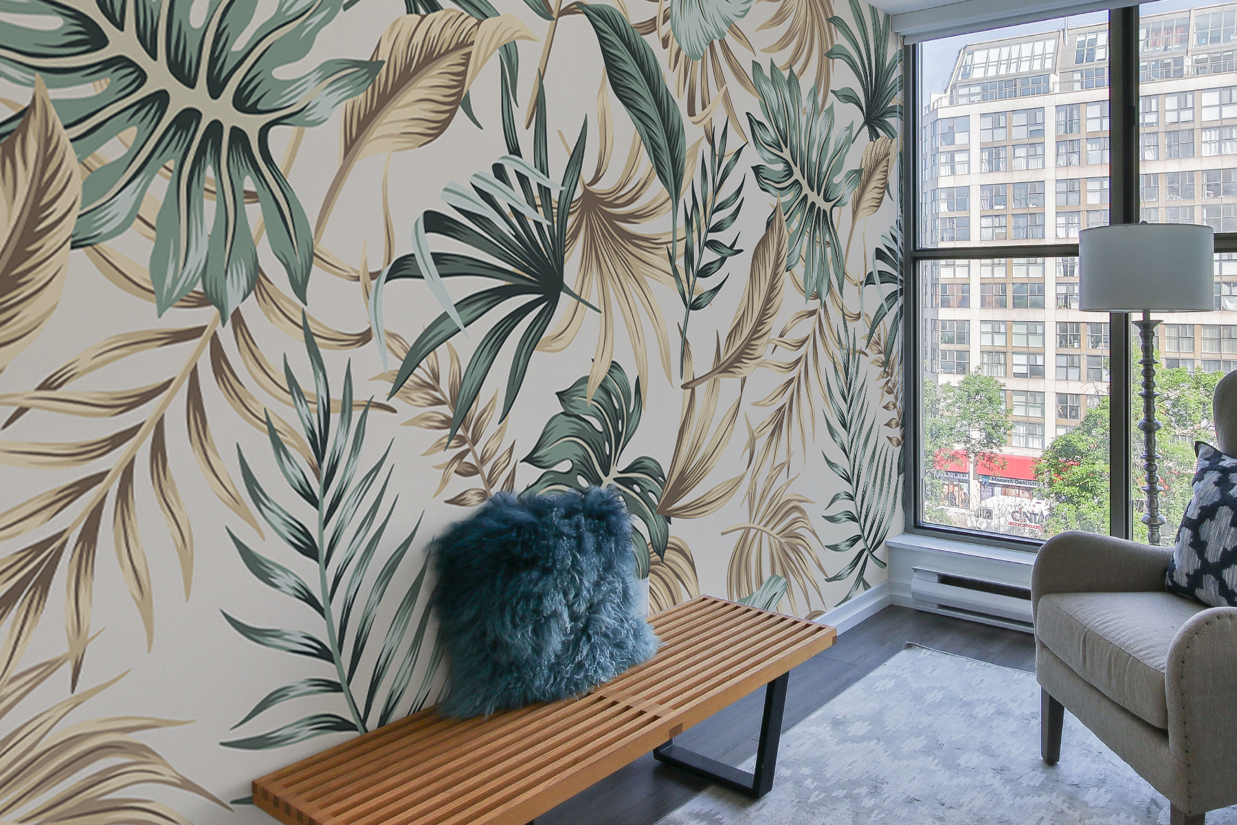 Transform your space with this delightful wall mural featuring tropical leaves on a warm beige background. It’s like bringing a slice of the jungle right into your living room—without the mosquitoes, of course! The soft, earthy tones create a calming vibe, perfect for cozy evenings or bright, sunny days. Imagine curling up with a book, surrounded by lush greenery, letting your mind drift to distant shores. It might even spark a little daydreaming about tropical getaways or outdoor adventures. Add some personality to your walls and watch your room come to life!