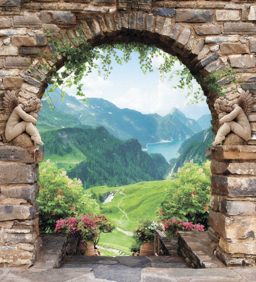 Step into a dreamy escape with this stunning wall mural, featuring a stone archway framing a breathtaking view of a lush valley. Imagine sipping your morning coffee while soaking in those rolling hills and vibrant flora. It’s like having a window to nature without the bugs! The serene scene adds a touch of tranquility, perfect for a cozy living room or that little reading nook that needs a bit more charm. Plus, those cherubs on the sides? Adorable little guardians of your space. It’s not just decor; it’s a daily invitation to pause and breathe.