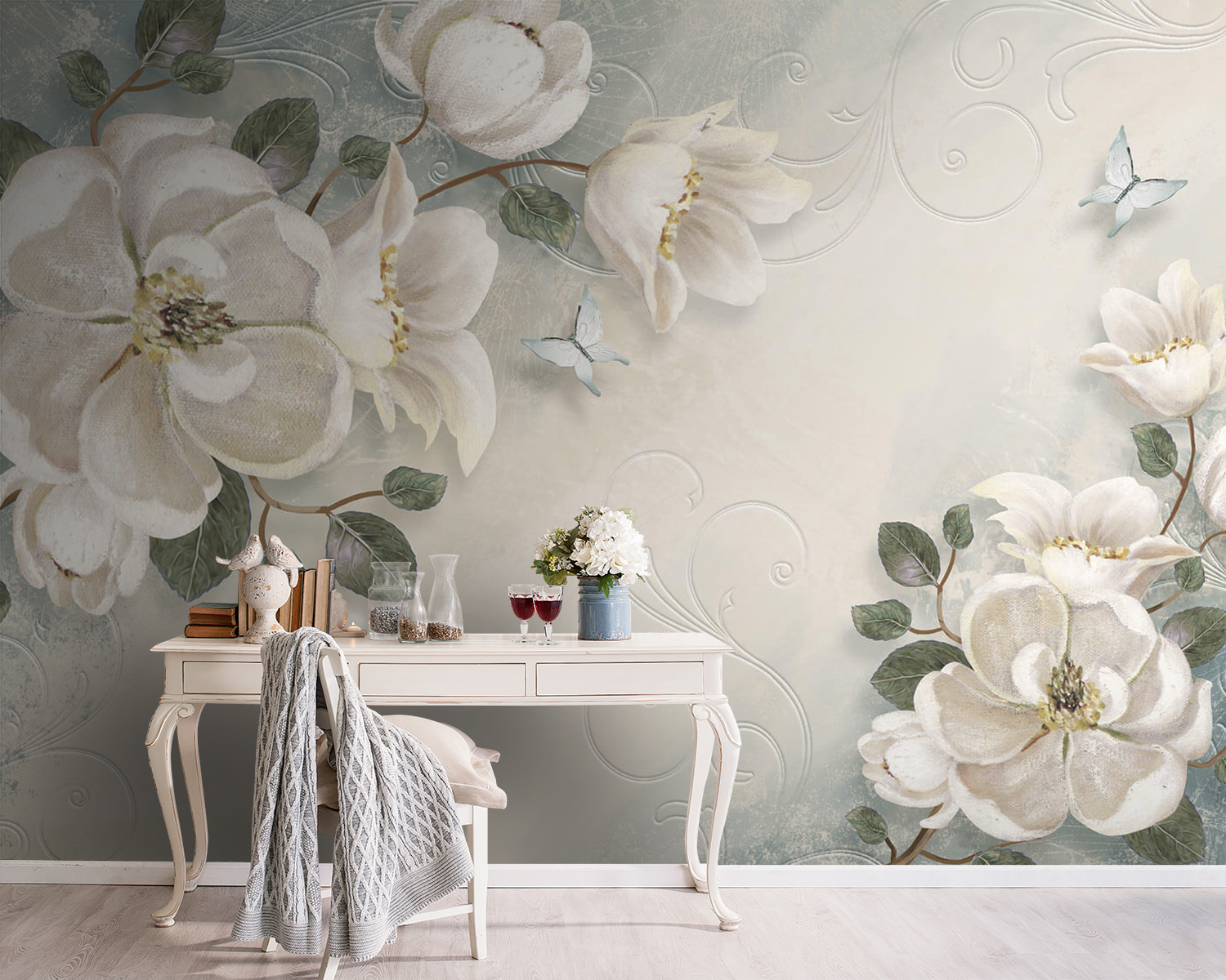 Transform your space into a serene retreat with this enchanting wall mural featuring delicate white flowers and leaves against a soft background. It’s like bringing a garden indoors—minus the watering can. Imagine sipping coffee in a room where petals seem to dance on the walls, evoking a calm, spa-like vibe. The light colors create an airy feel, making even the coziest corners seem spacious. Friends might just think you’ve unlocked the secret to effortless elegance. Perfect for creating a warm atmosphere, this mural whispers tranquility, inviting everyone to pause and breathe. A little touch of nature can go a long way.