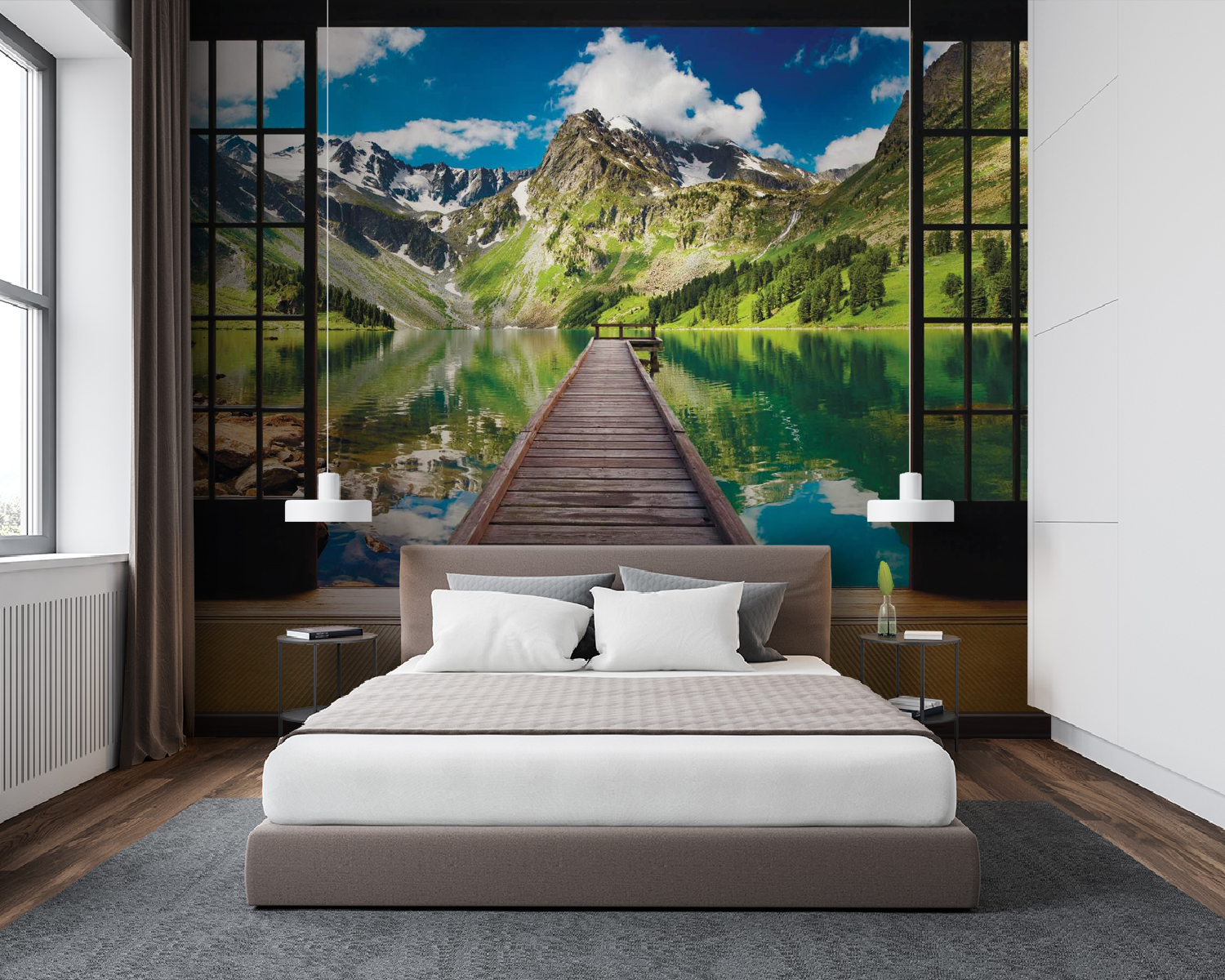 Imagine stepping into a cozy room and being greeted by a breathtaking view of a tranquil lake, framed by majestic mountains. This mural, called “Wooden Dock over a Lake,” brings the outdoors inside, turning even the gloomiest day into a serene escape. It’s like having a peaceful vacation spot right at home—without the need for sunscreen! The vibrant greens and deep blues are so soothing; one could almost hear the water lapping against the dock. Perfect for a chill corner or that one wall that needs a spark of life, this mural is a gentle reminder of nature’s beauty. Grab a cup of tea, kick back, and let the scenery work its magic!