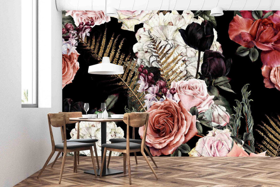 Transform any space into a floral paradise with this stunning wall mural, featuring a vibrant pattern of lush flowers. Imagine stepping into a room kissed by nature, where roses in rich hues and delicate blooms weave a tale of garden beauty right on your walls. It’s like having a private garden oasis—no watering required! The deep, dark background brings the flowers to life, offering a touch of drama and elegance. Perfect for sprucing up a cozy nook or making a bold statement in a larger area. Friends might even ask if you’ve got a secret garden they don’t know about. Just a little flair, a hint of nature—what’s not to love?